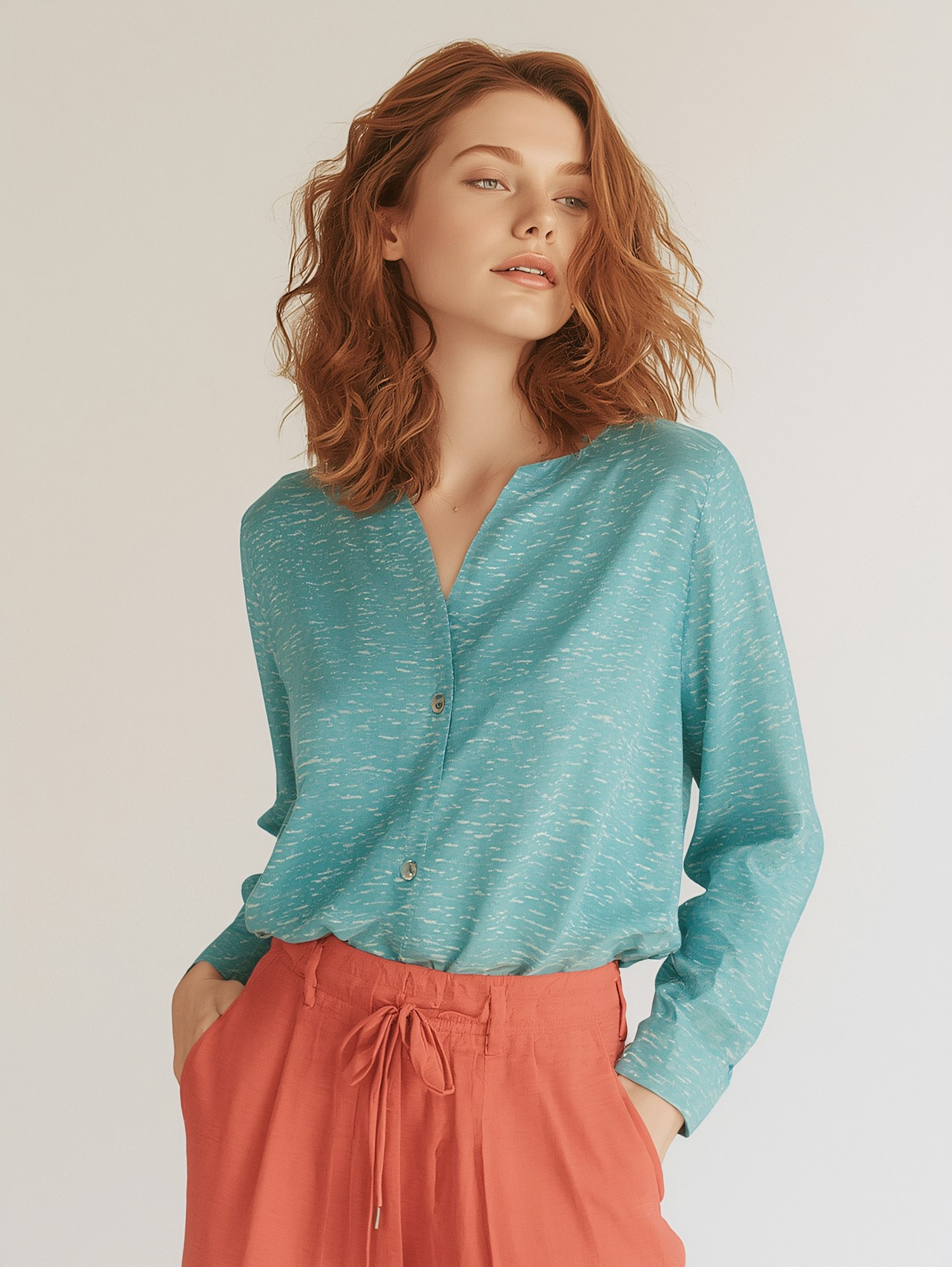 Woman in teal blouse and coral pants, posing confidently with hands in pockets against a light background.