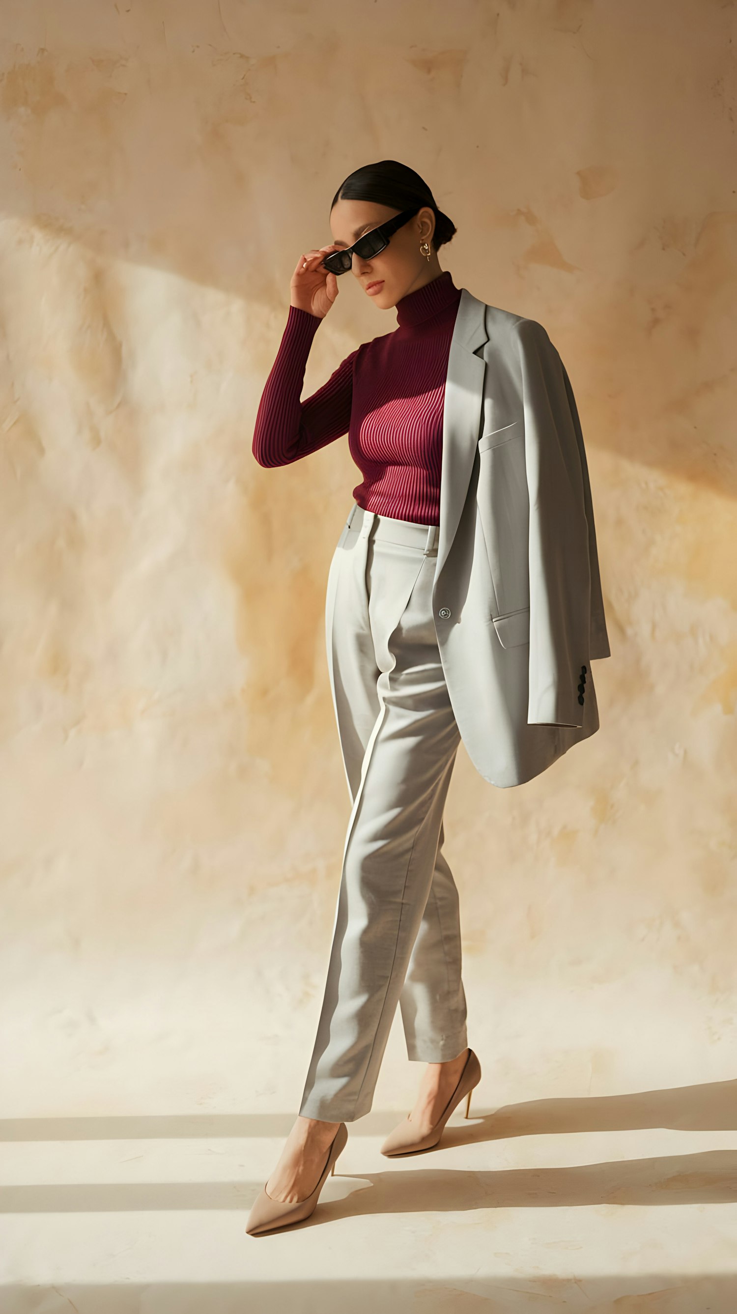 Chic woman in burgundy turtleneck, gray blazer, and trousers, accessorized with sunglasses and heels, posing in warm lighting.