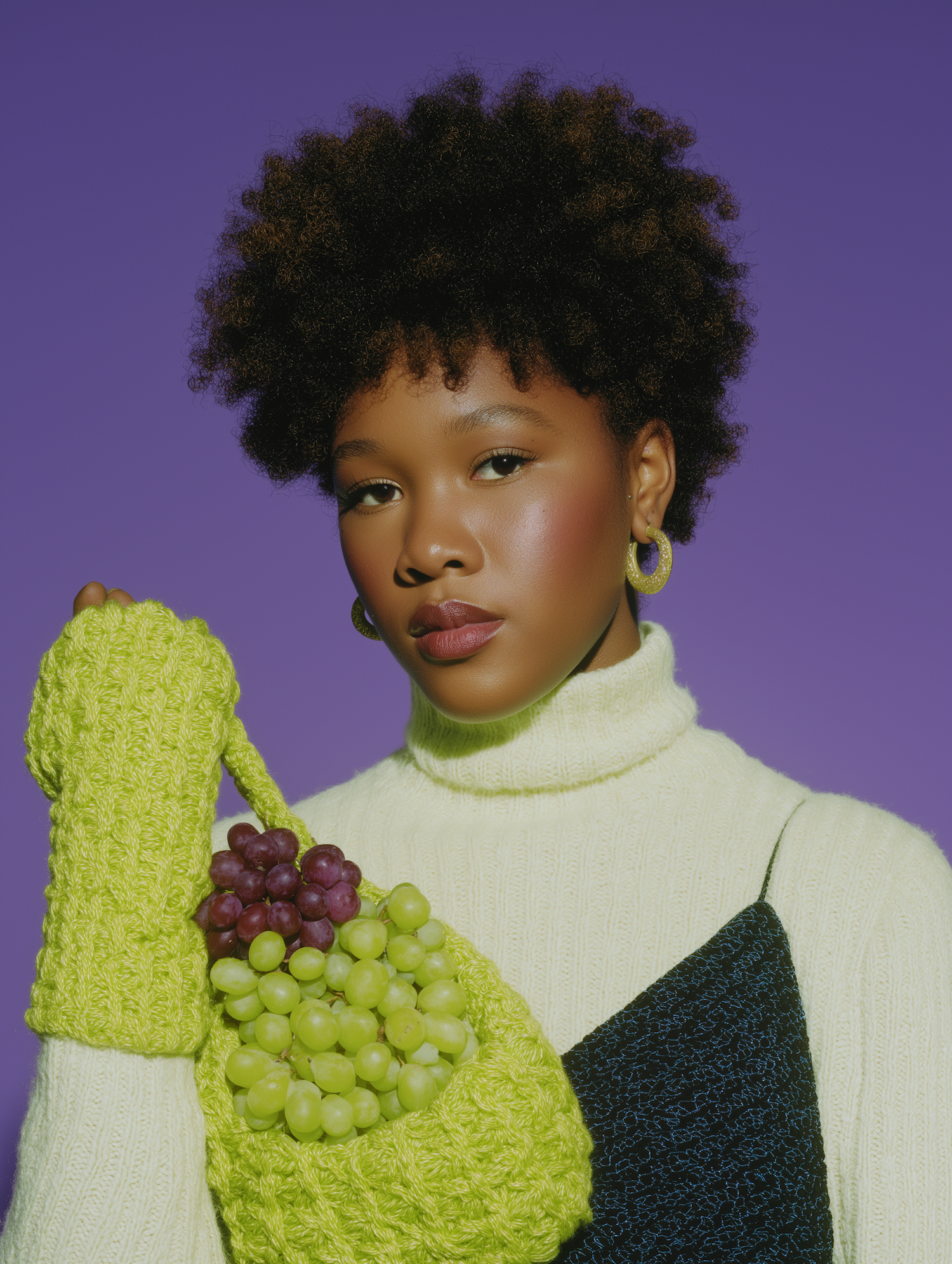 Stylish woman in a yellow turtleneck and green knitted accessories holding a bag of grapes against a vibrant purple background.