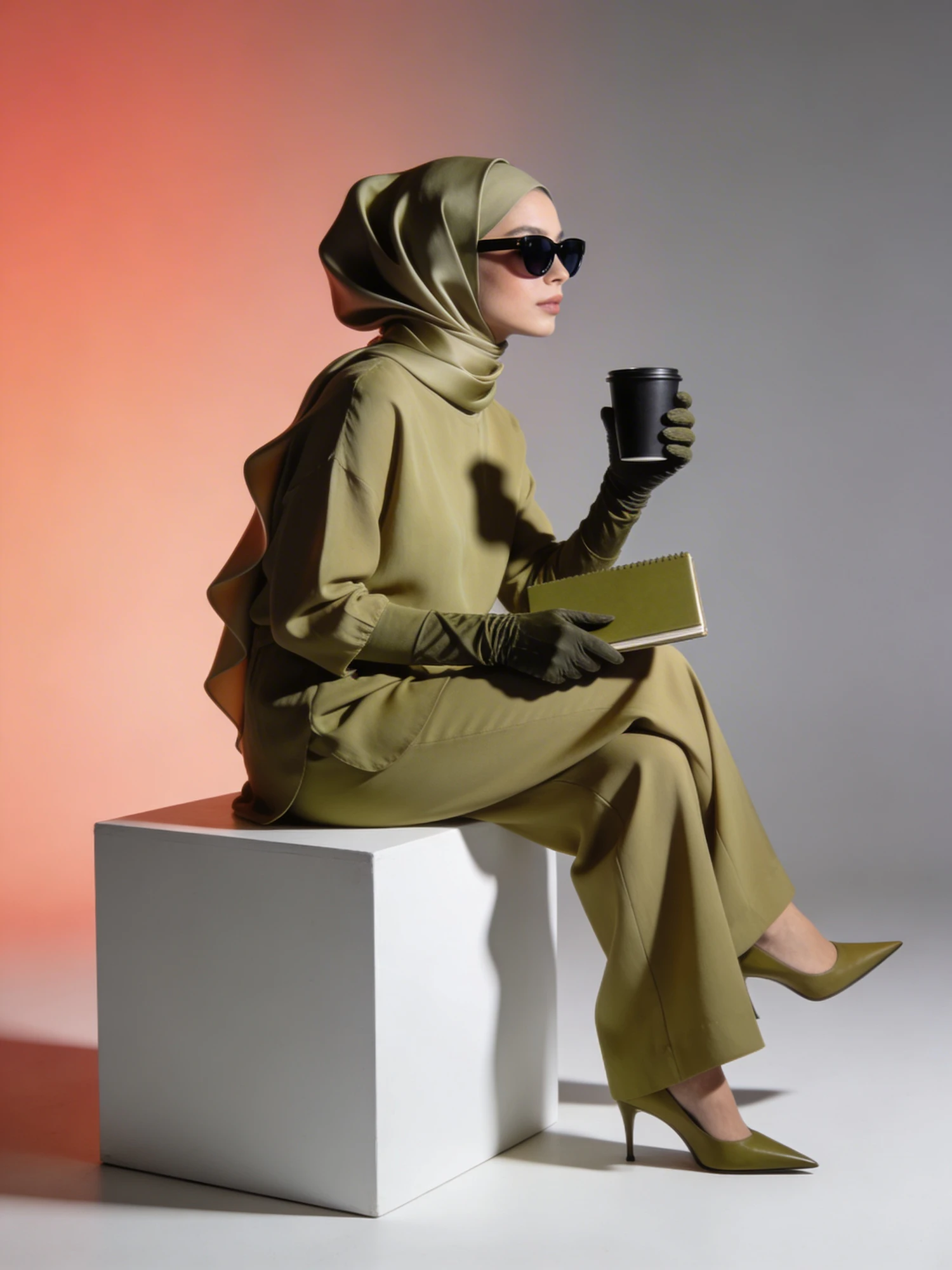 A high‑definition, minimalist editorial portrait. A stylish person sits in a side‑profile pose on a white cube, holding a matte‑black coffee cup in one hand and a slim olive notebook in the other. They wear a soft‑olive monochrome outfit: relaxed long‑sleeved top, wide‑leg trousers, and a sculptural hijab with smooth folds. Accessories include dark sunglasses, fitted gloves, and pointed heels. The background blends from muted coral to neutral grey with dramatic studio lighting. No logos, no watermarks, no extra text.