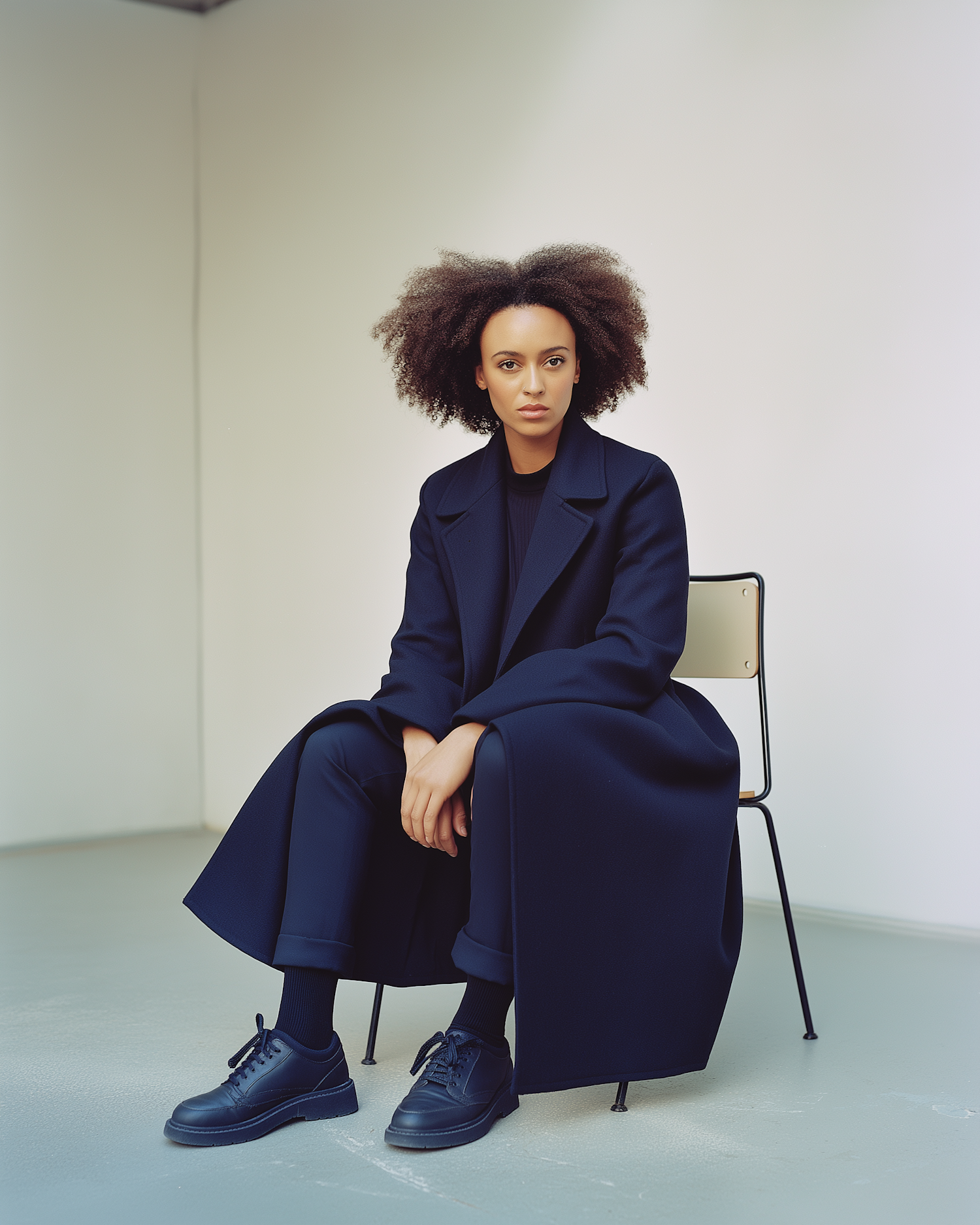 Stylish woman in a navy coat and tailored pants sits confidently in a minimalist setting, showcasing modern fashion and elegance.