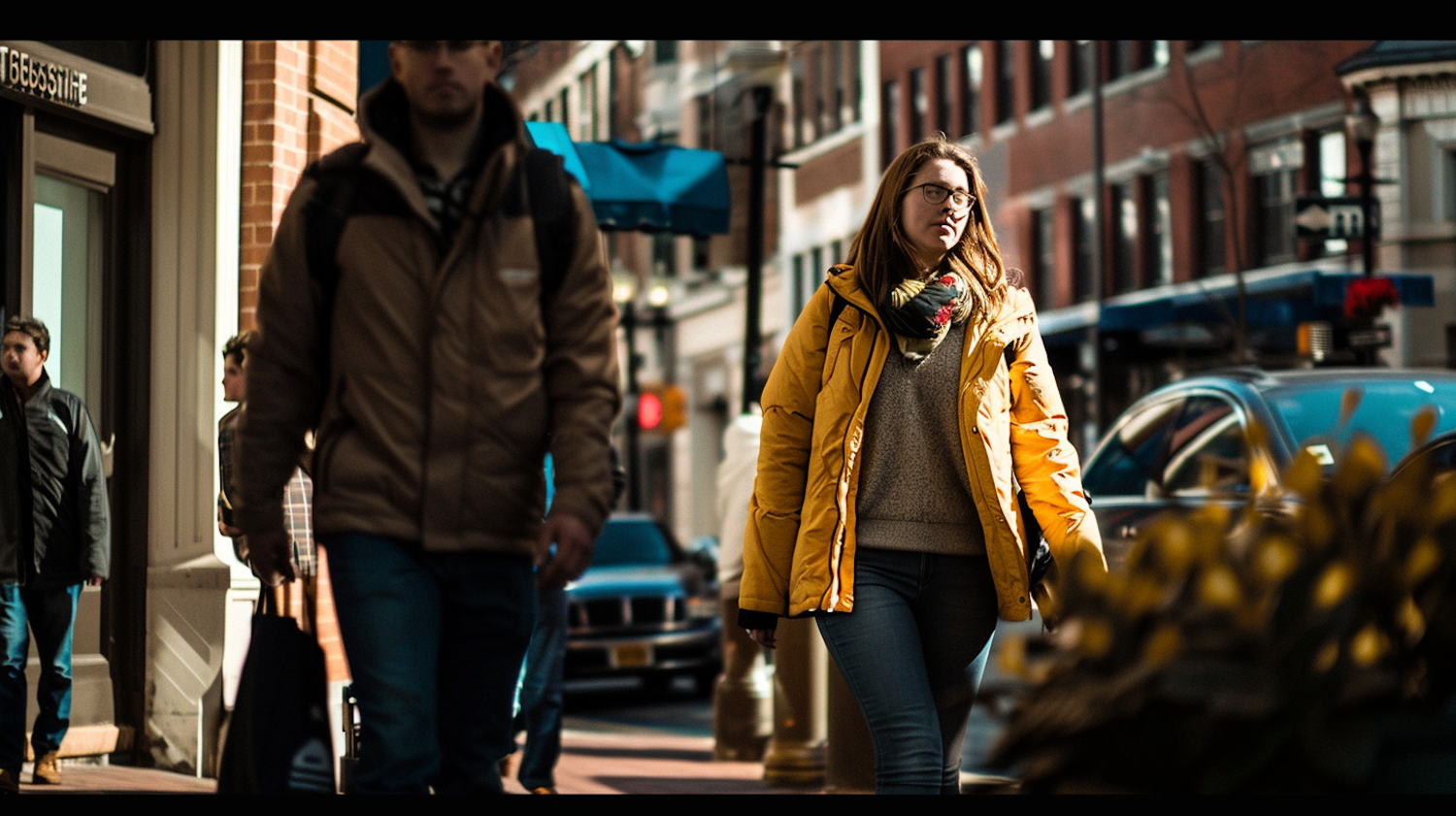 Urban street scene with a woman in a yellow coat and a man in a brown jacket walking past each other.