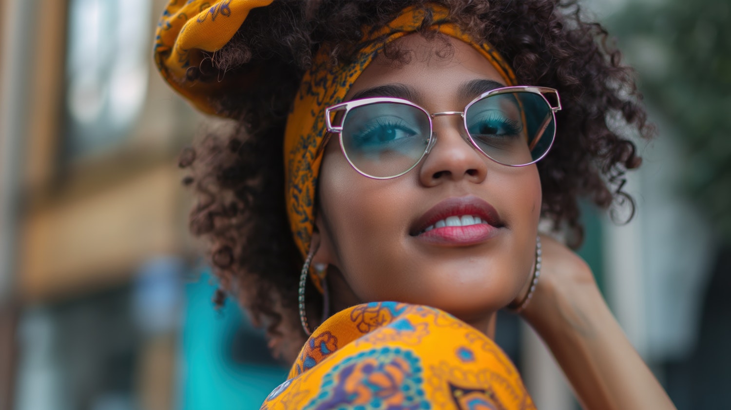 Close-up of a stylish woman with curly hair, wearing a yellow headscarf and glasses, exuding confidence and elegance.