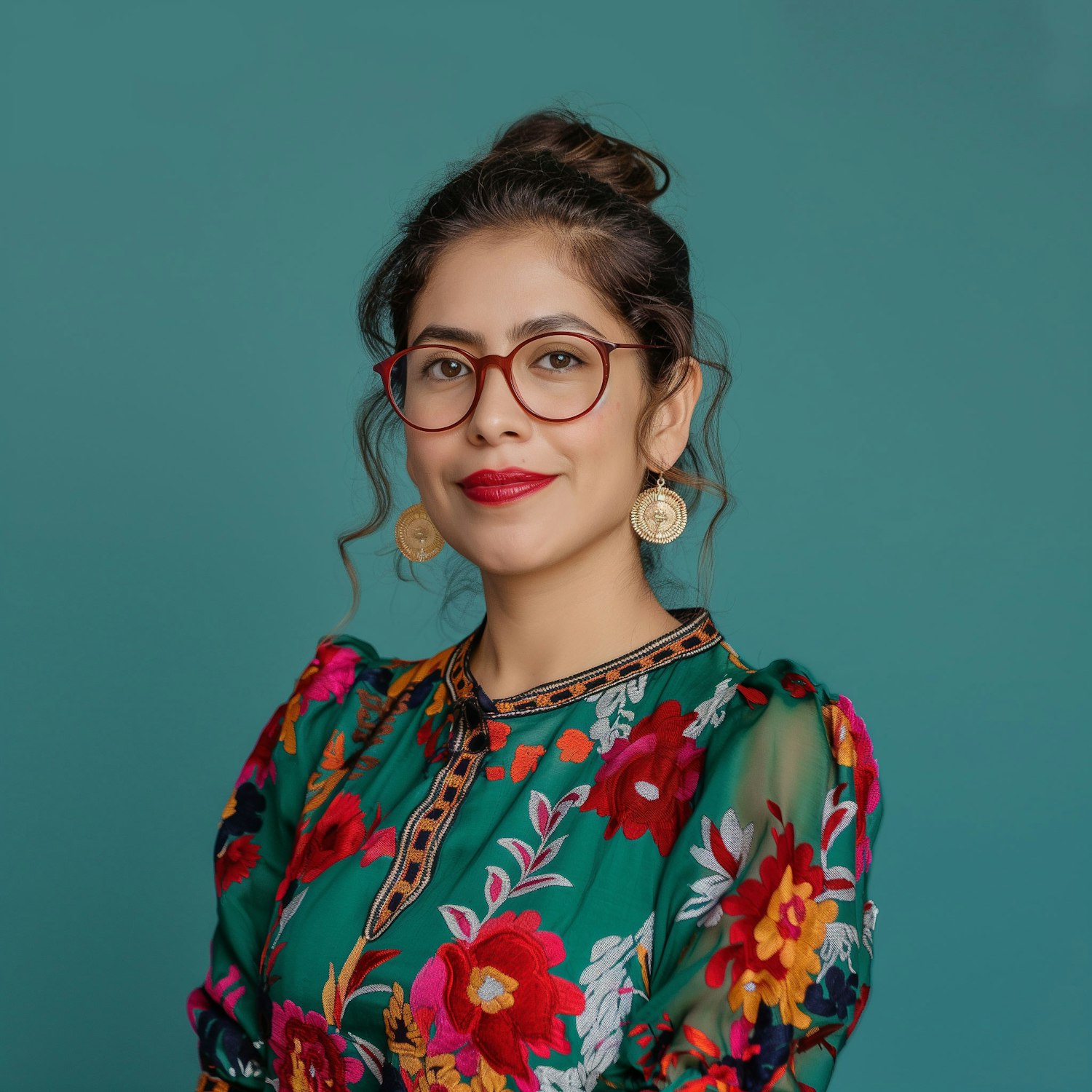 Woman with red glasses and floral dress against teal background, exuding elegance and style with gold earrings and a confident smile.