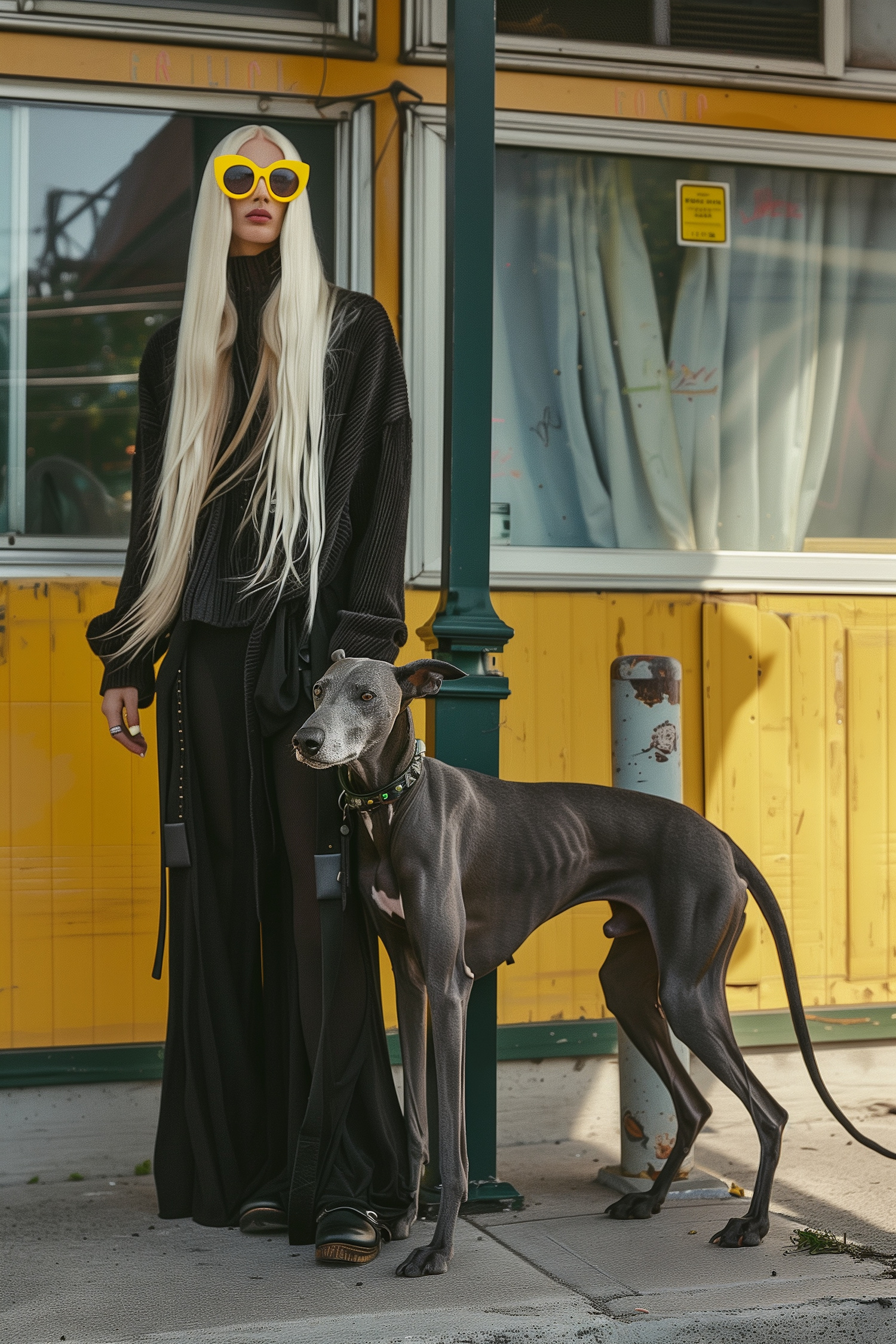 Stylish individual with platinum blonde hair and yellow sunglasses poses with a sleek Italian Greyhound in front of a retro yellow diner.