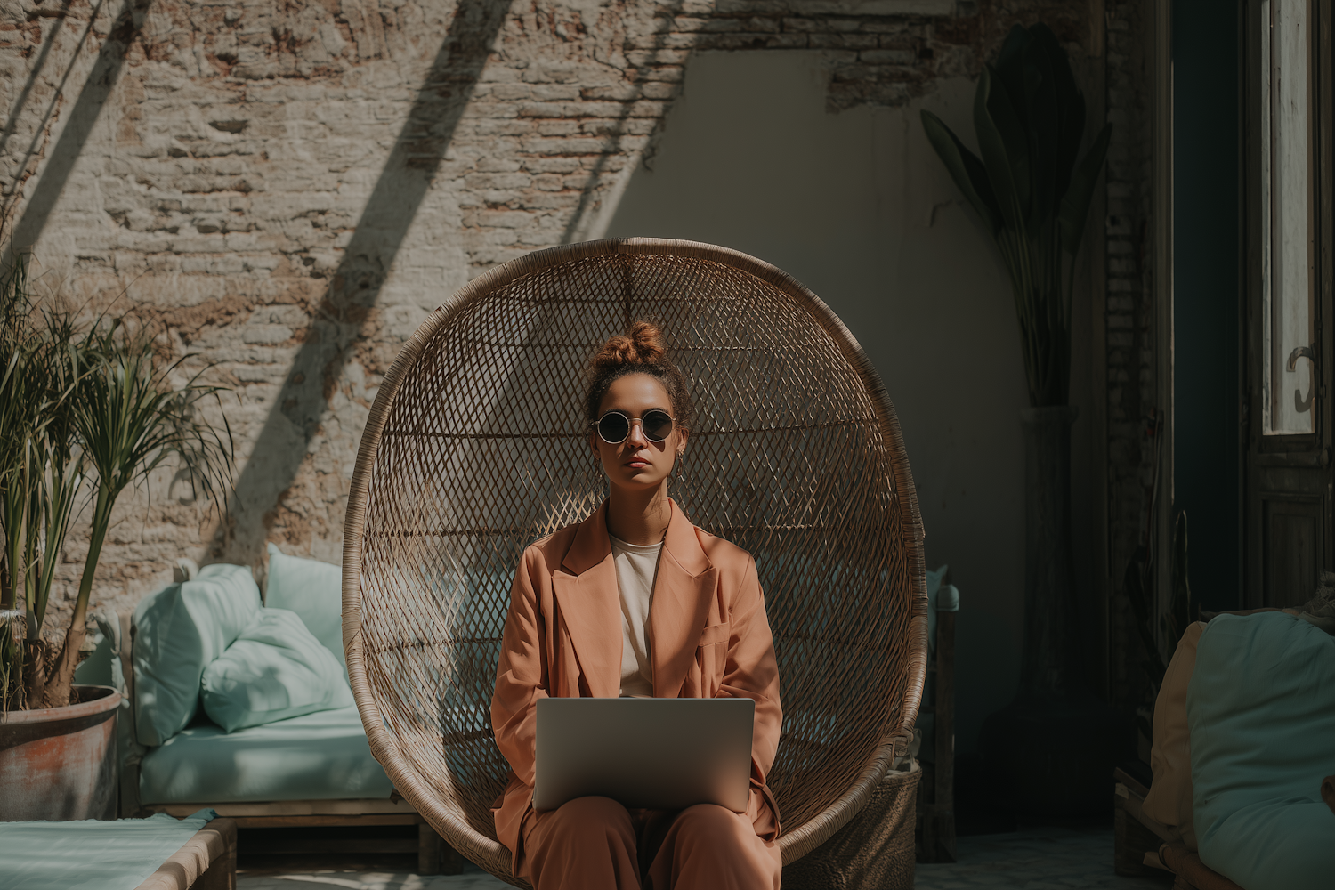 Stylish woman in a peach suit and sunglasses working on a laptop in a sunlit, rustic setting with plants and cozy decor.