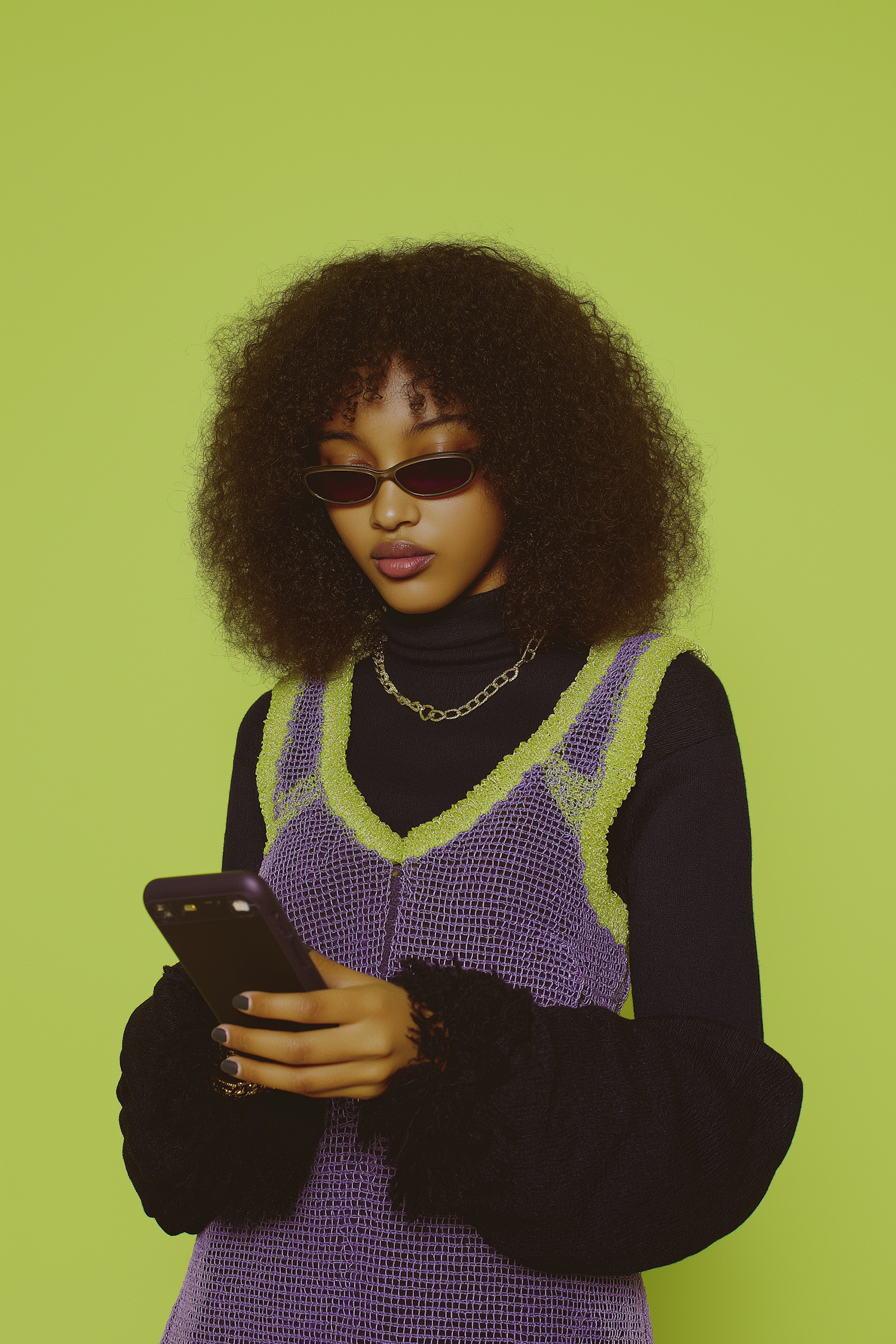 Stylish woman in a purple mesh vest and sunglasses, focused on her phone against a bright lime green background.