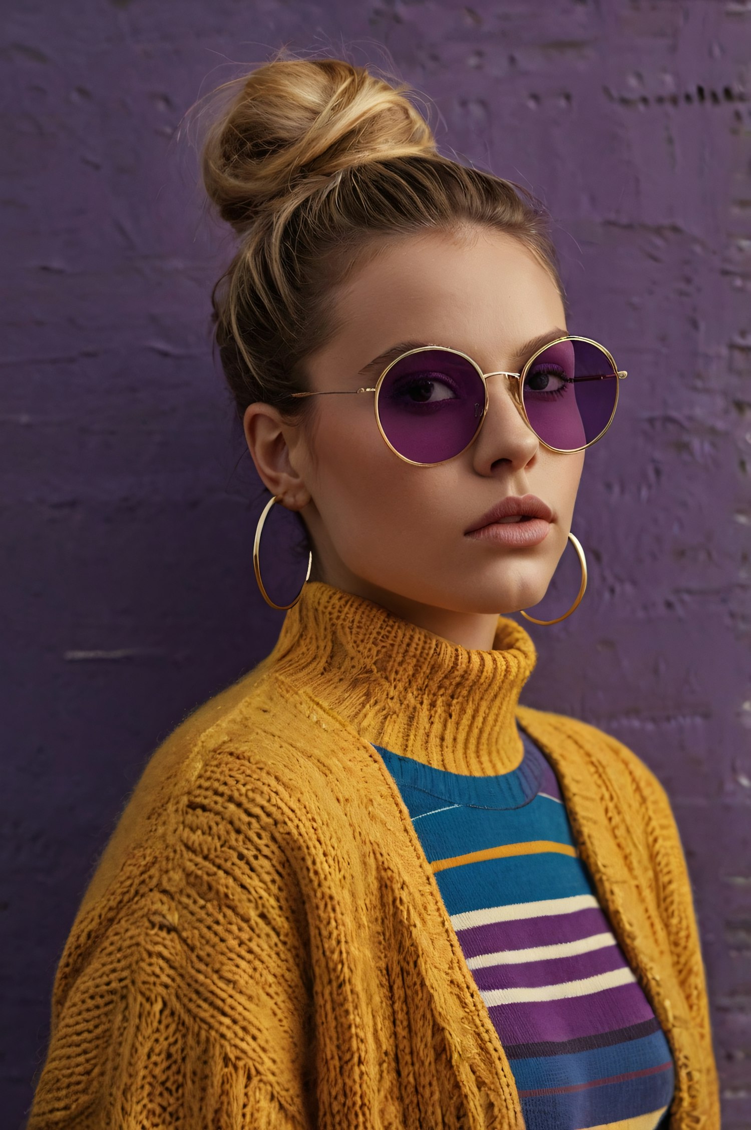 Stylish woman in purple sunglasses and yellow sweater against a purple wall, showcasing bold fashion and accessories.