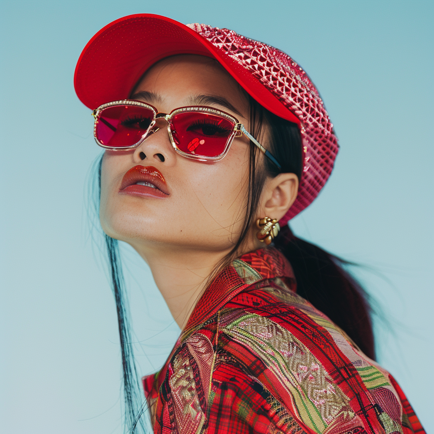 Stylish woman in red cap and sunglasses, wearing a colorful patterned shirt against a soft blue background.