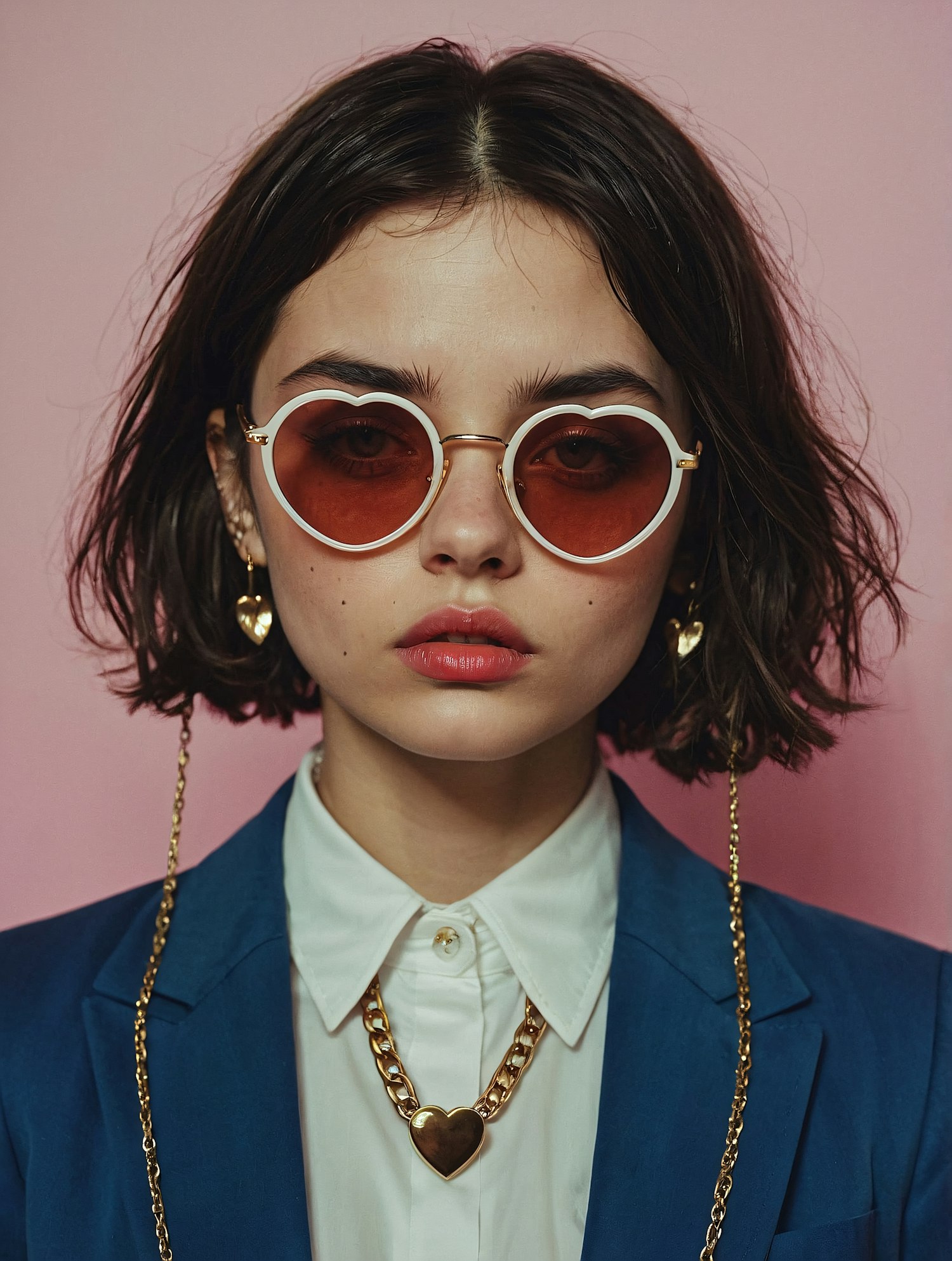 Stylish woman in heart-shaped sunglasses, gold jewelry, and a blue blazer against a pink background. Bold and modern fashion.
