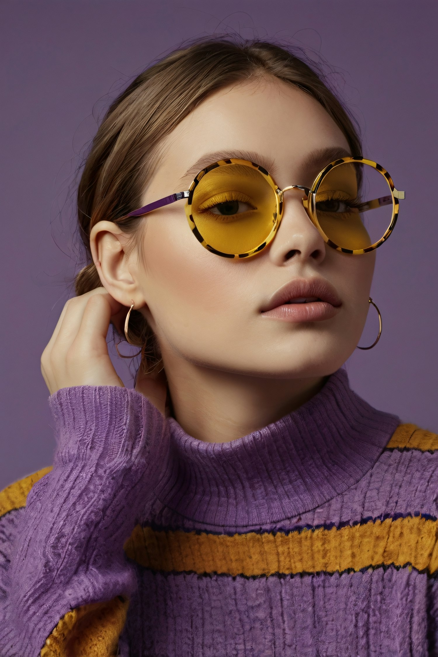 Stylish woman in yellow-tinted sunglasses and purple sweater against a matching purple background.