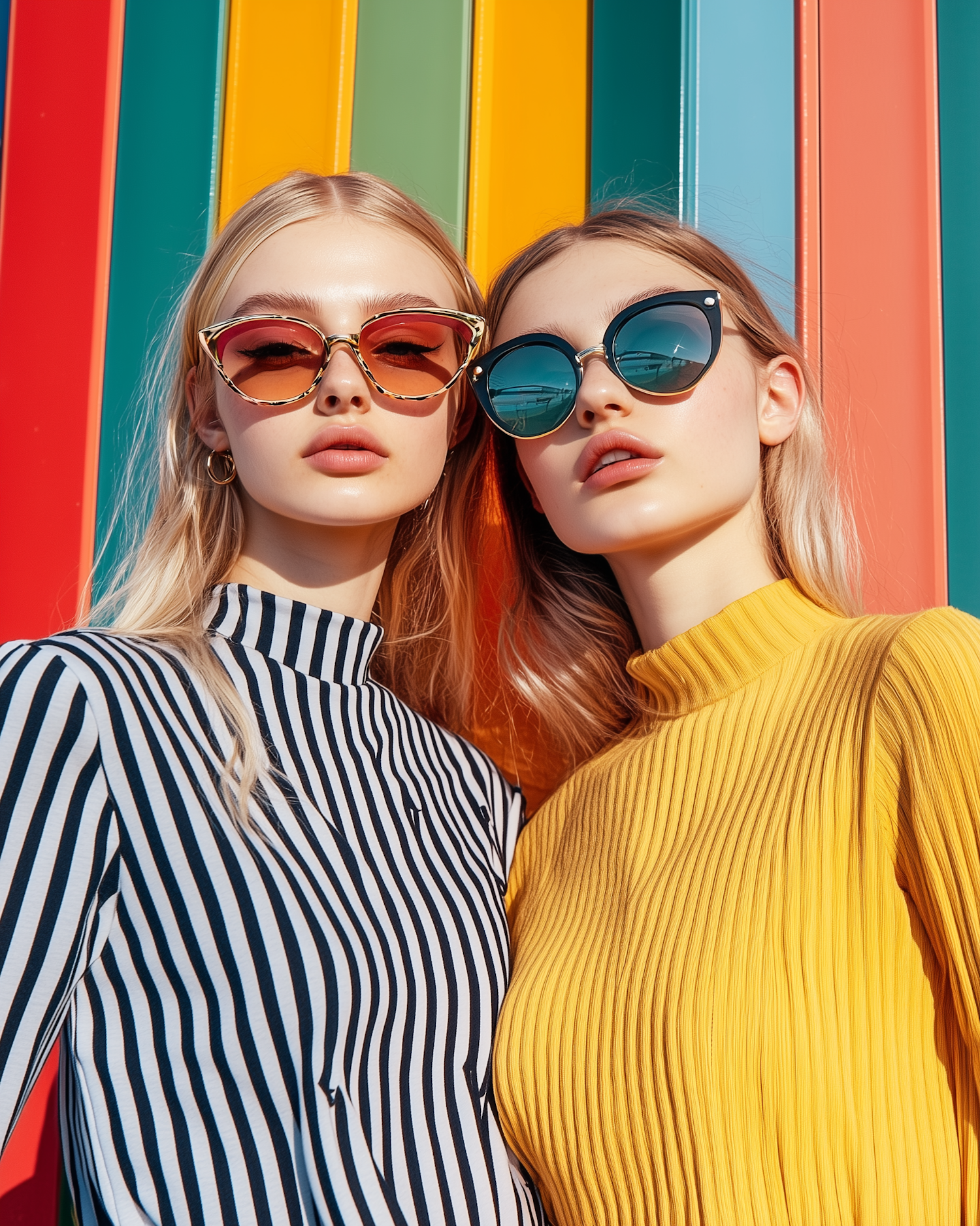 Two stylish women in bold sunglasses and vibrant outfits pose against a colorful striped background, exuding modern fashion vibes.