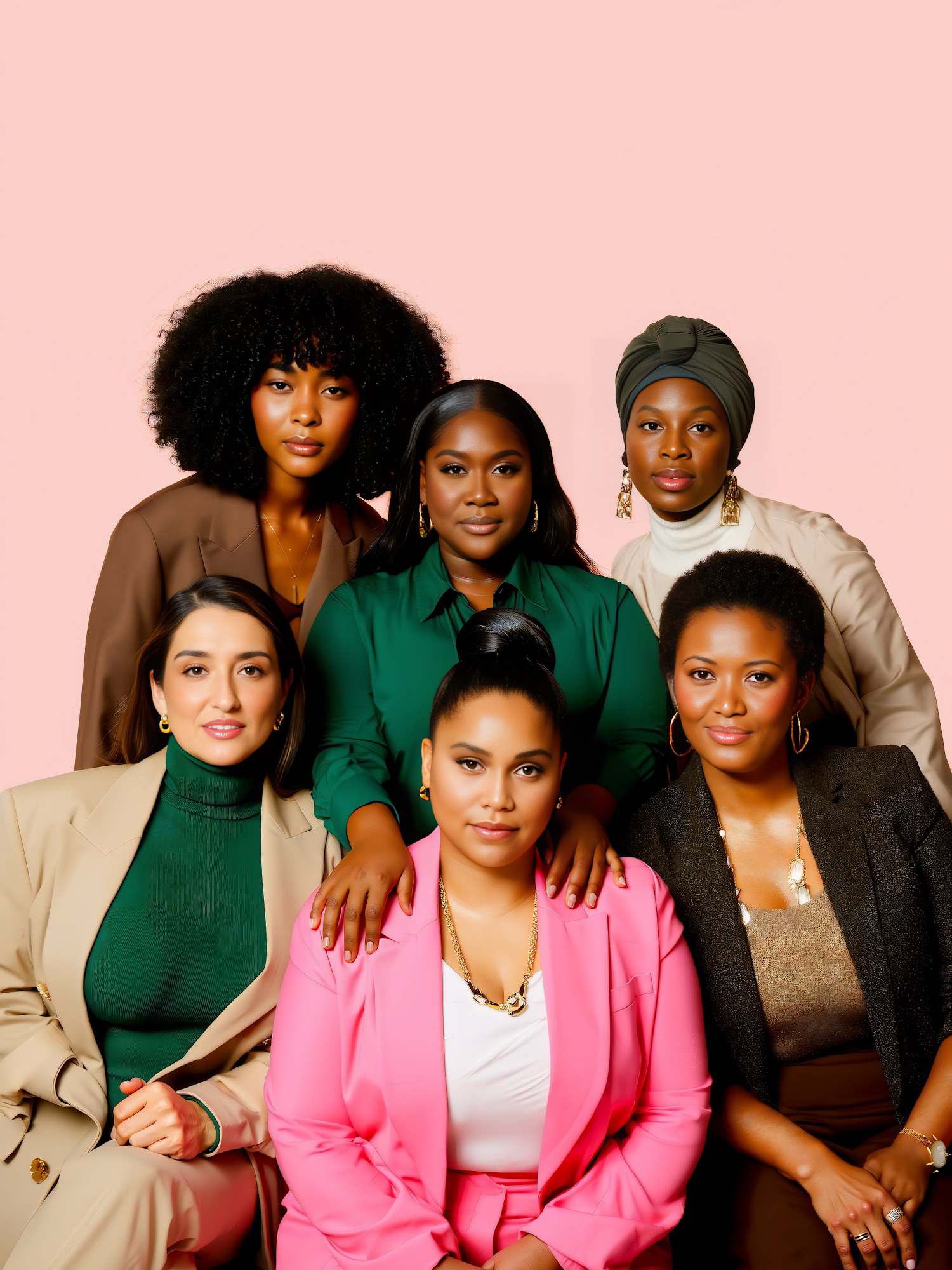 A group of six women in stylish, professional attire poses confidently against a pink background, showcasing diversity and unity.