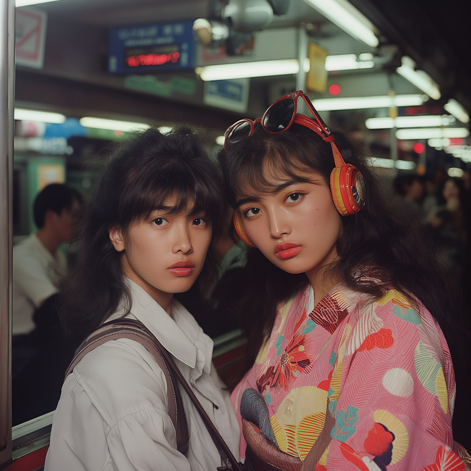 Two stylish women in a subway, one in a kimono with headphones, the other in a white shirt. Urban fashion and culture.
