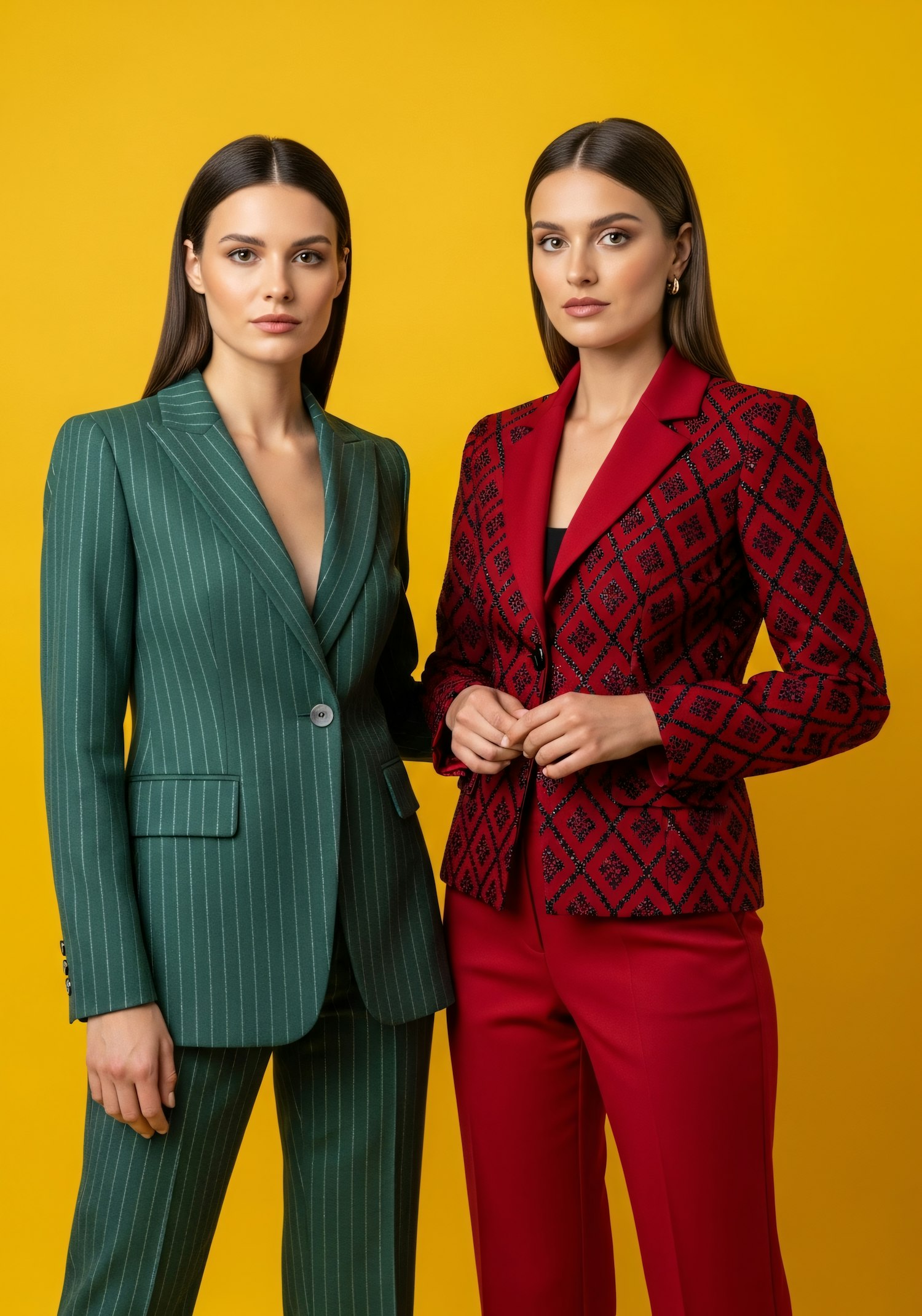 Two women in stylish green and red suits pose against a vibrant yellow background, showcasing modern and professional fashion.