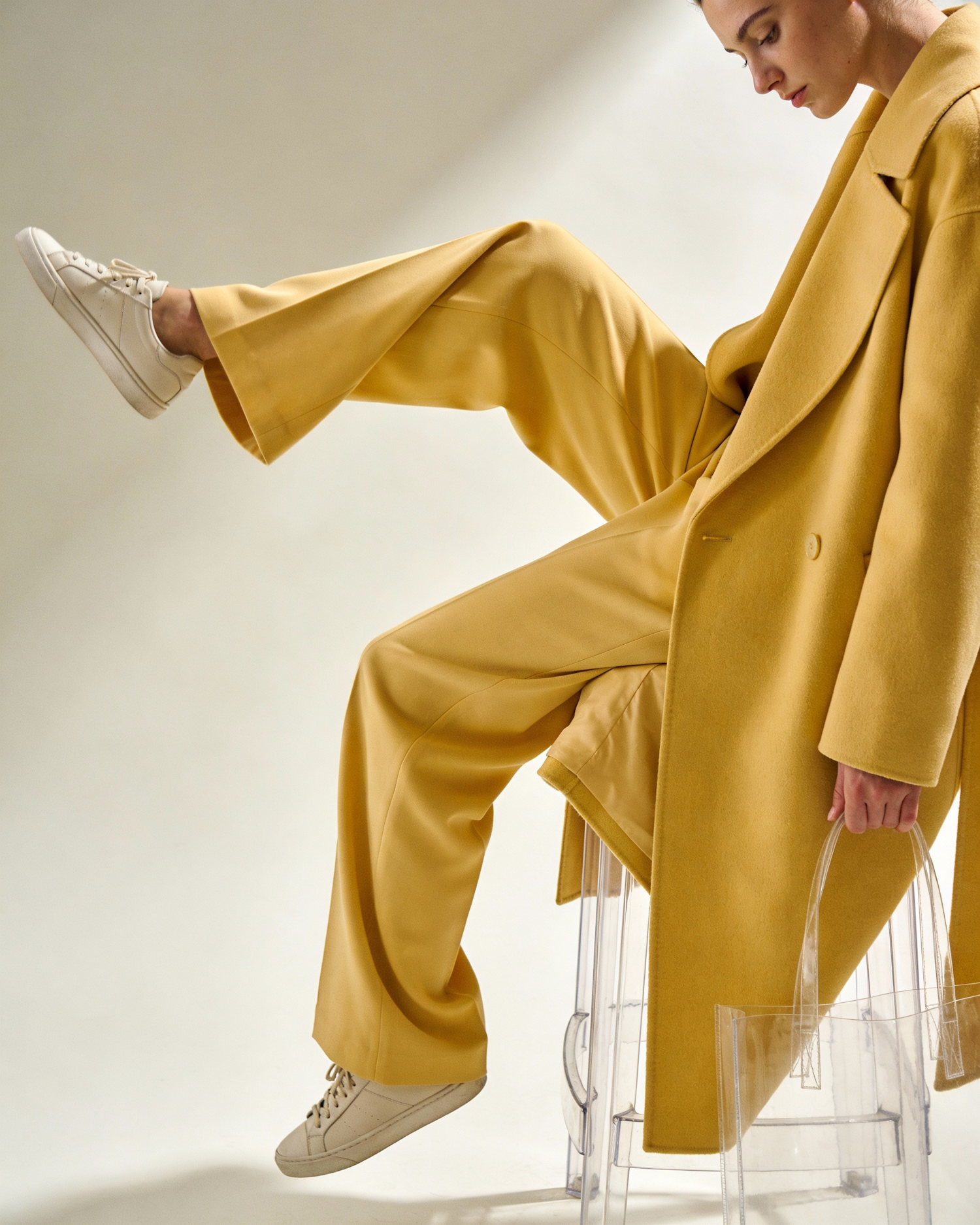 Stylish individual in a yellow outfit with white sneakers, seated on a clear chair, holding a transparent bag in a minimal setting.