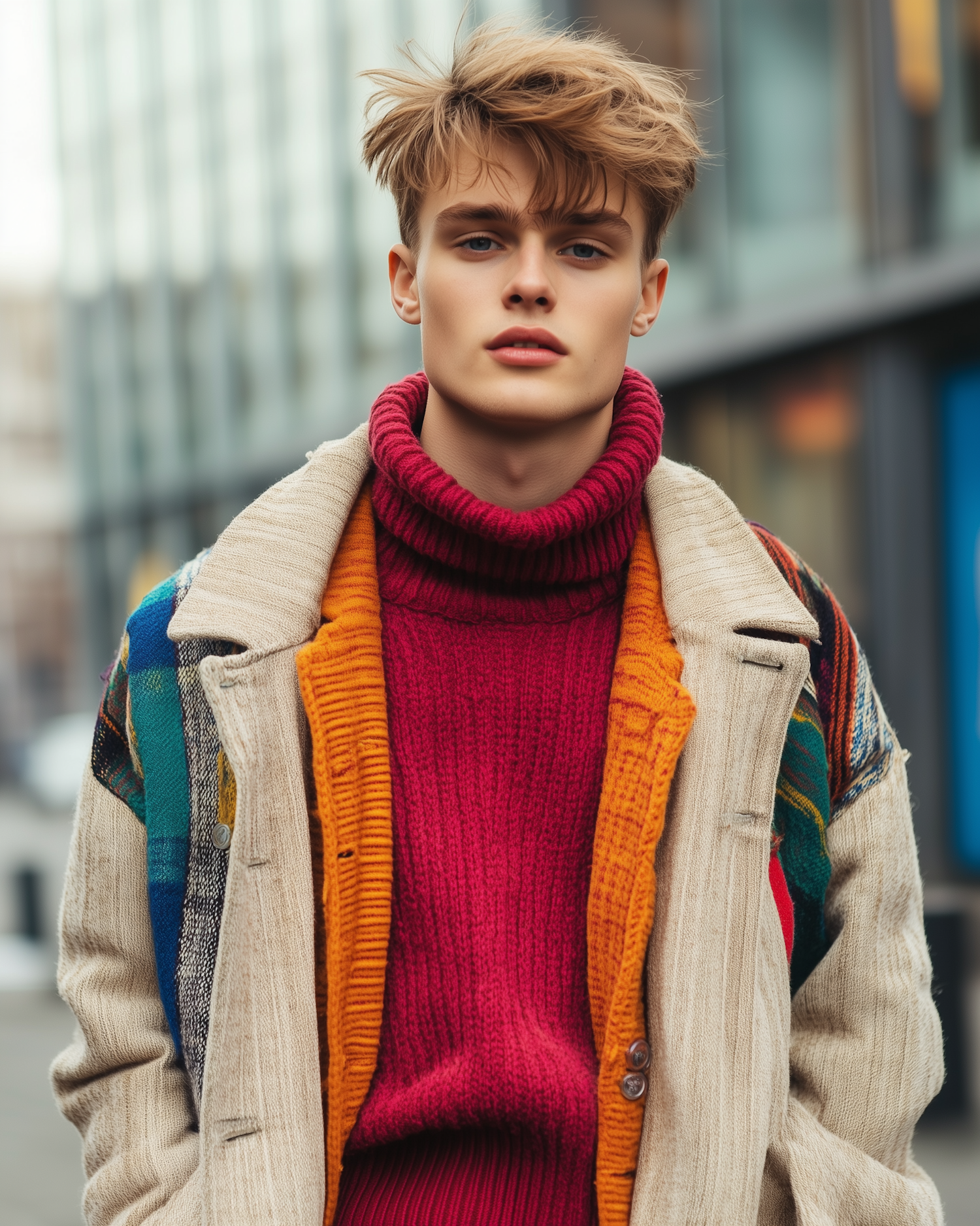 Stylish young man in a red turtleneck and patchwork coat in an urban setting, exuding confidence and modern fashion sense.