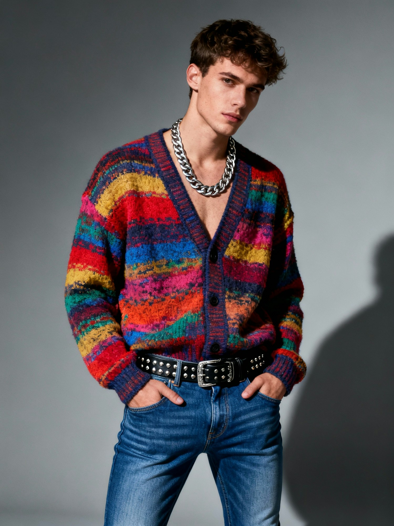 A stylish man in a vibrant cardigan and jeans, accessorized with a silver chain and studded belt, posing confidently.