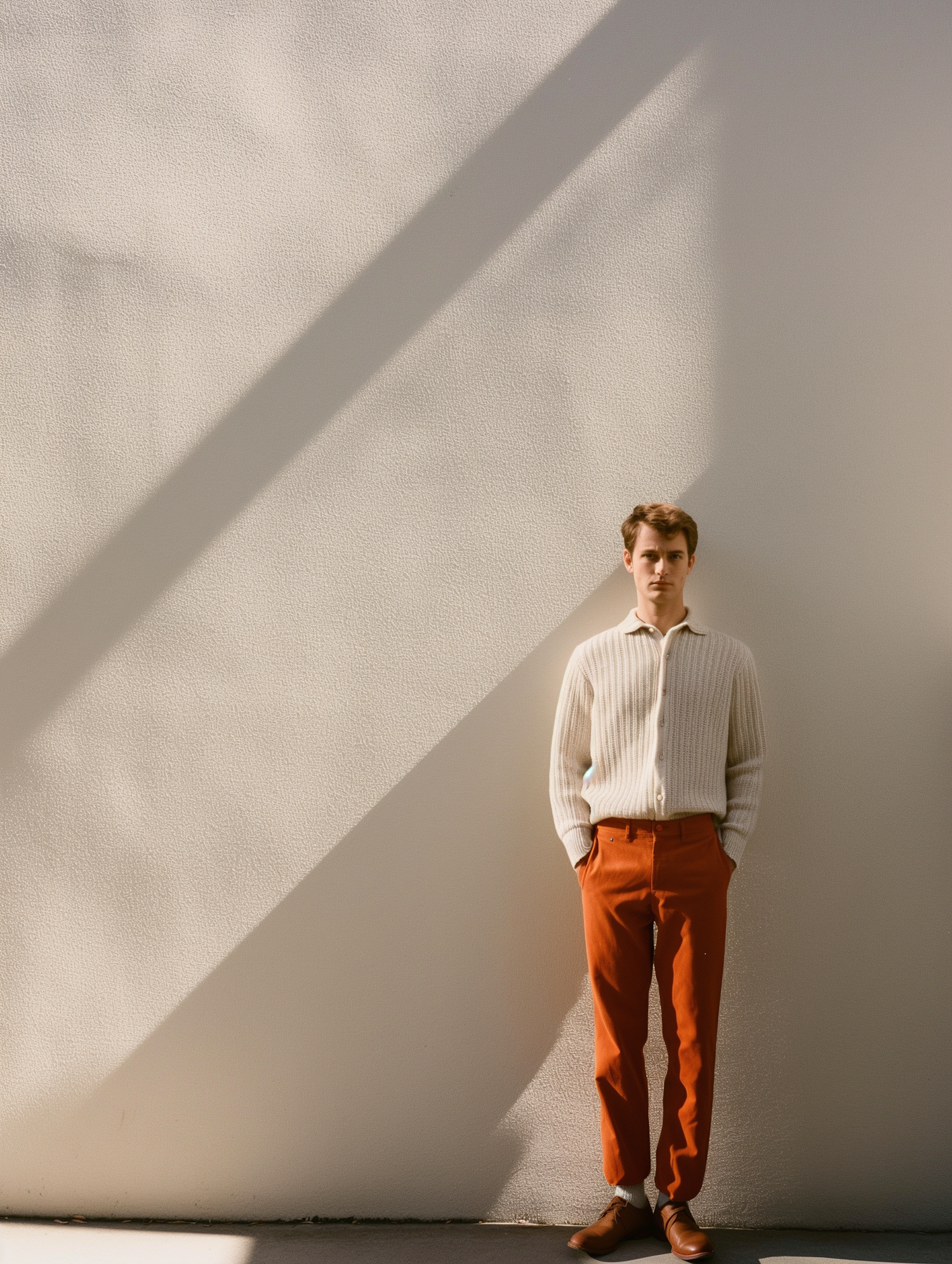 Young man in cream sweater and rust pants stands against a textured wall with dramatic shadows, creating a minimalist and stylish scene.