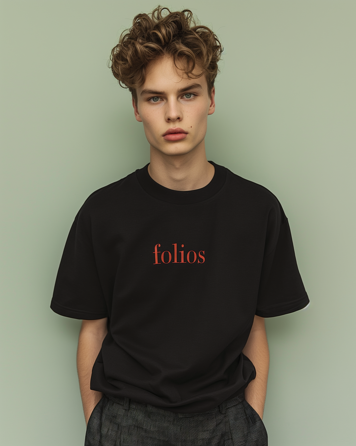 Young man with curly hair in a black 'folios' t-shirt against a green background, exuding a minimalist and calm vibe.