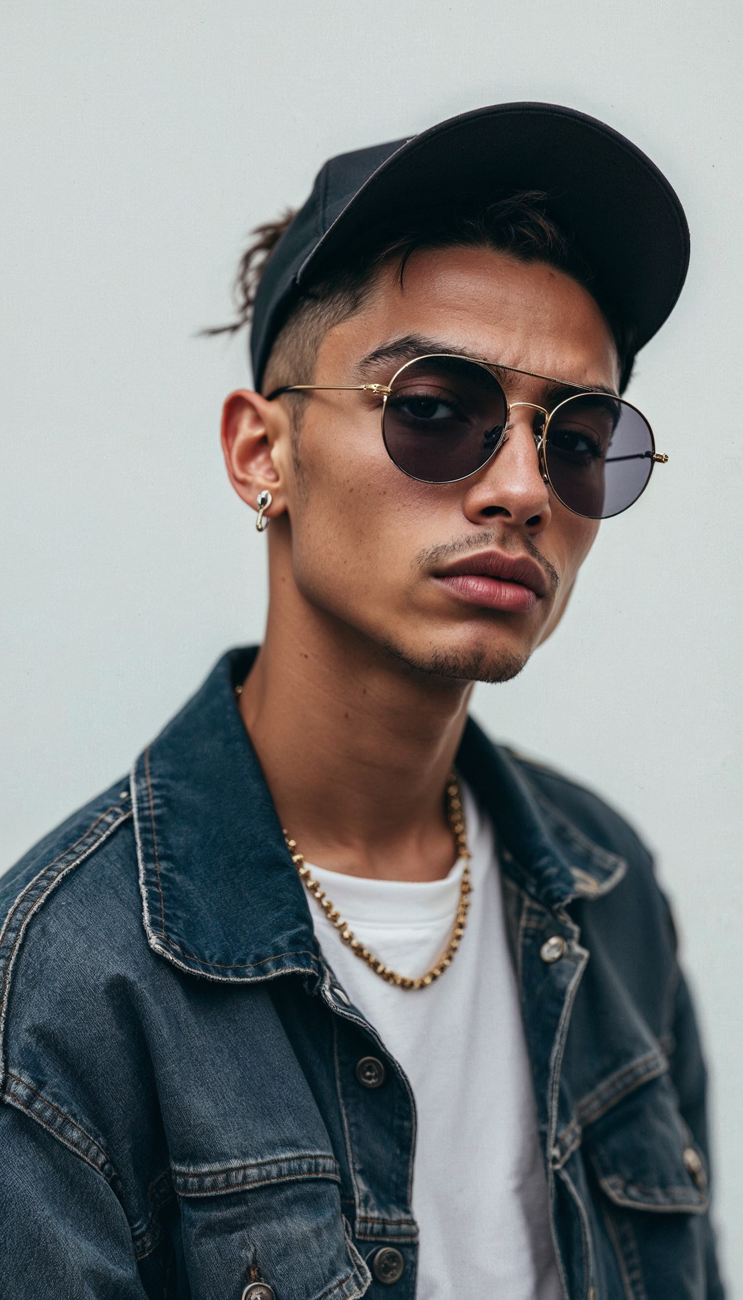 Stylish young man in denim jacket and sunglasses, wearing a cap and gold chain, exuding a cool and confident vibe.