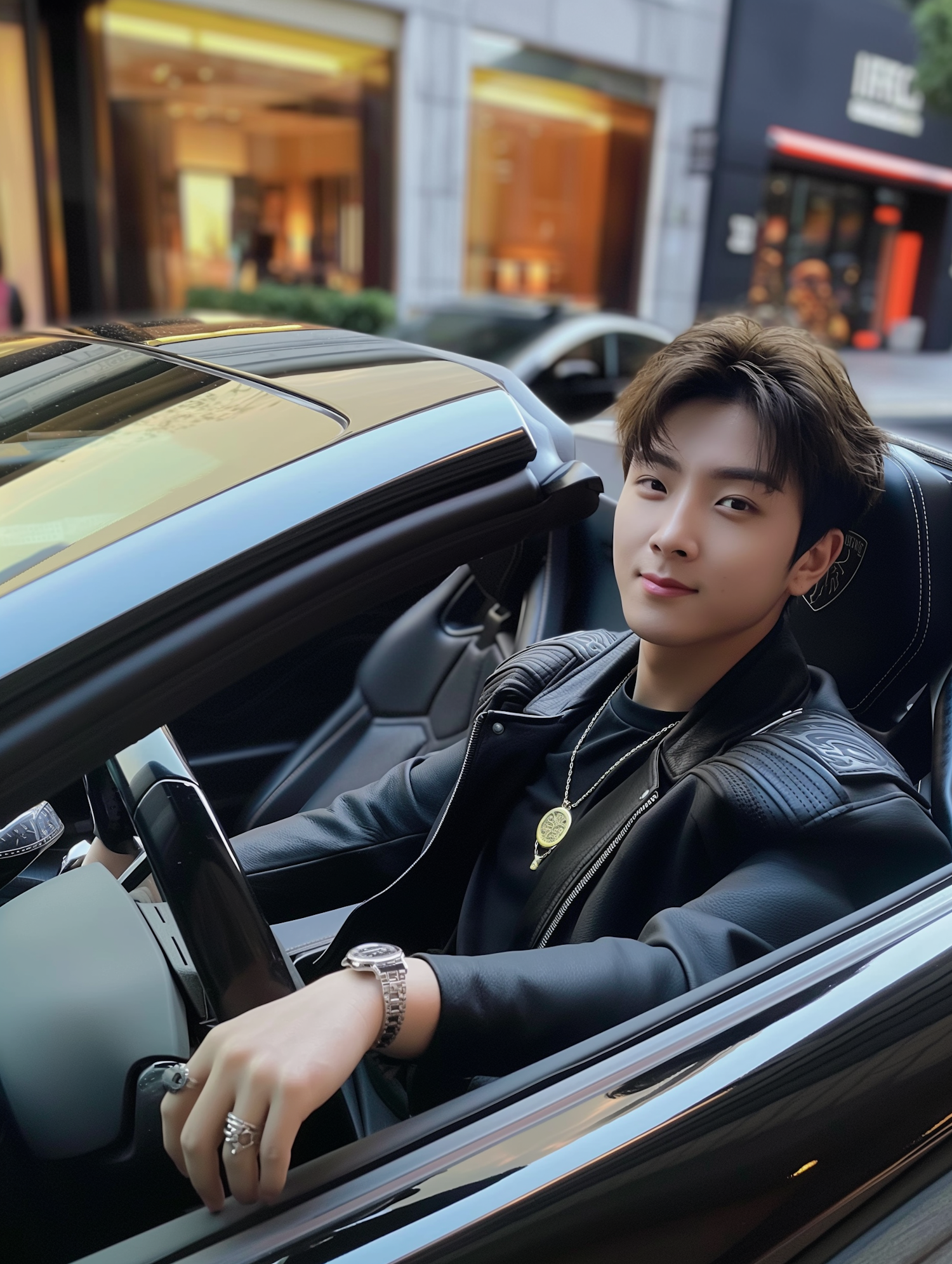 Stylish young man in a black convertible, wearing a leather jacket and gold pendant, exuding confidence in an urban setting.