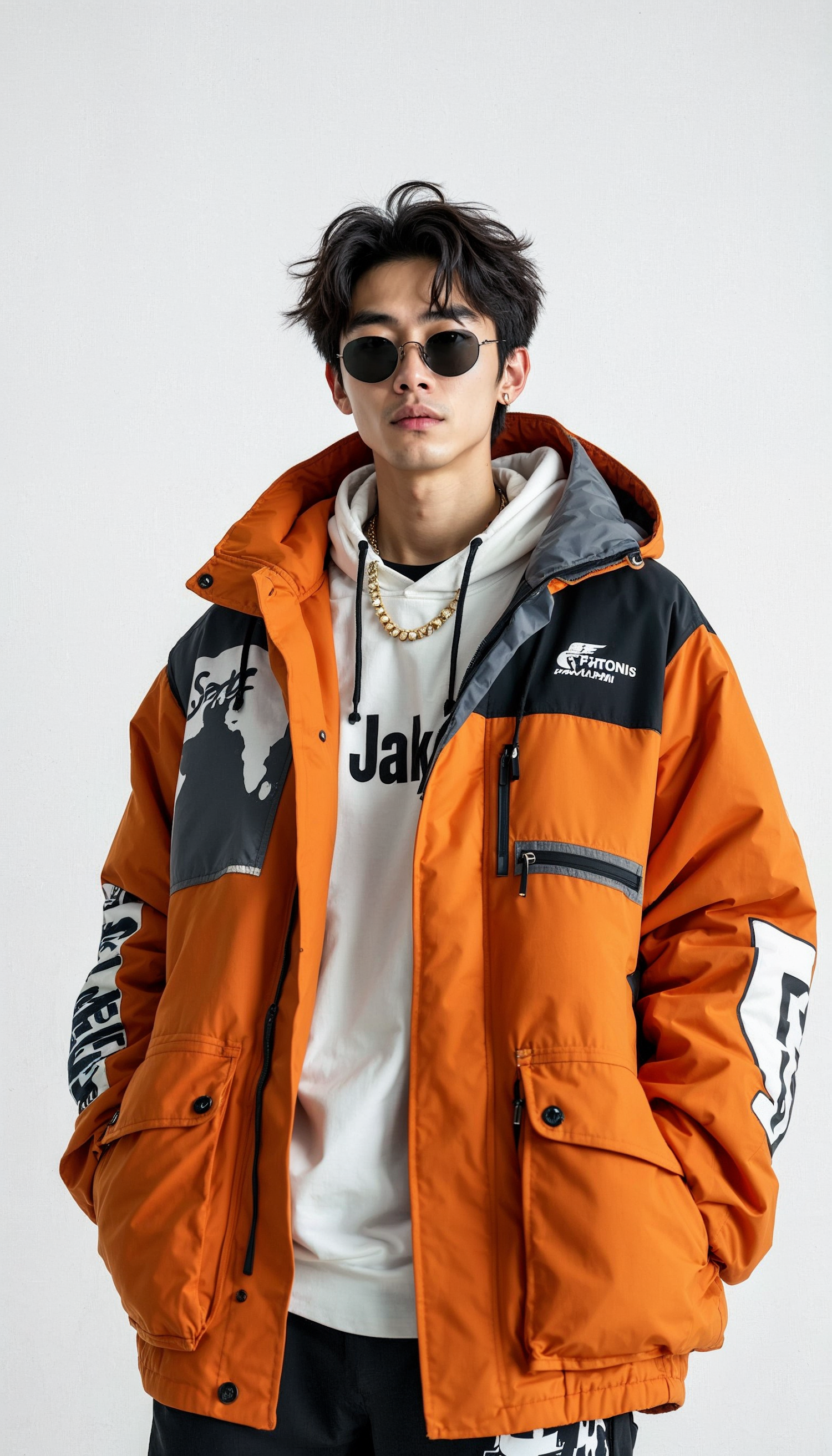 Stylish young man in orange jacket and sunglasses, exuding a cool streetwear vibe with a gold chain and graphic designs.