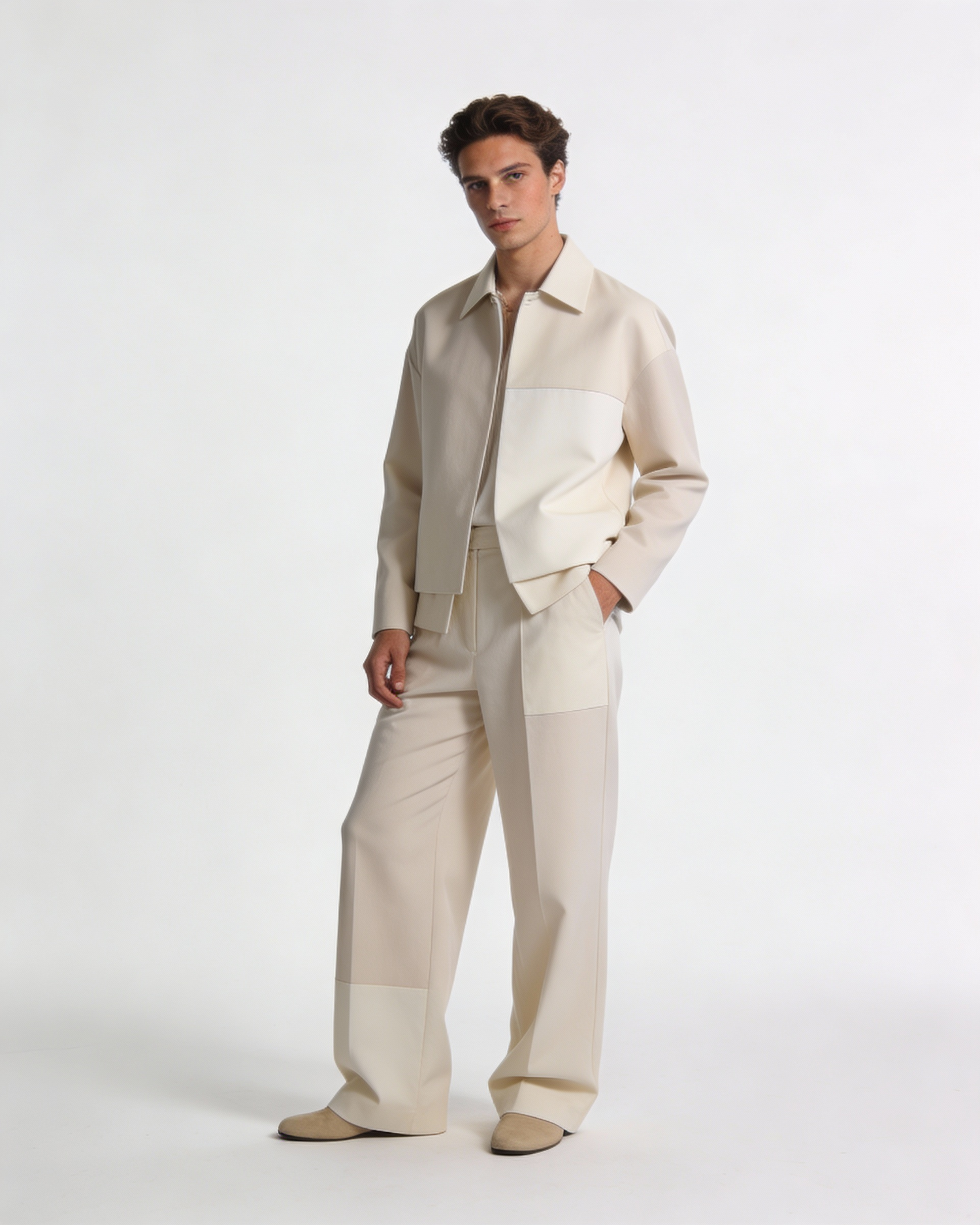 A young man in a cream-colored outfit poses confidently against a white background, showcasing a modern and minimalist fashion style.
