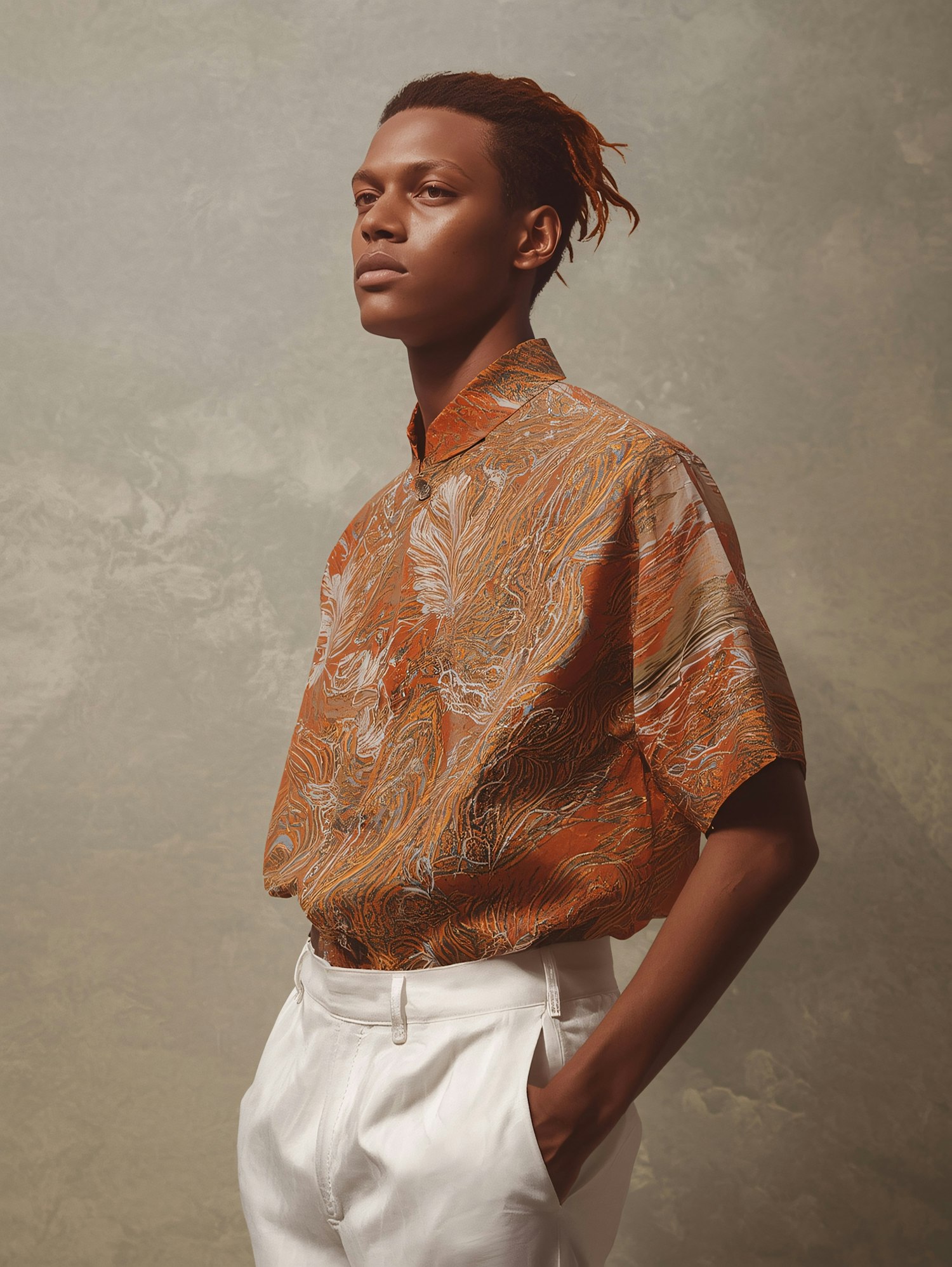 Stylish man in an orange patterned shirt and white trousers, posing confidently against a textured neutral background.