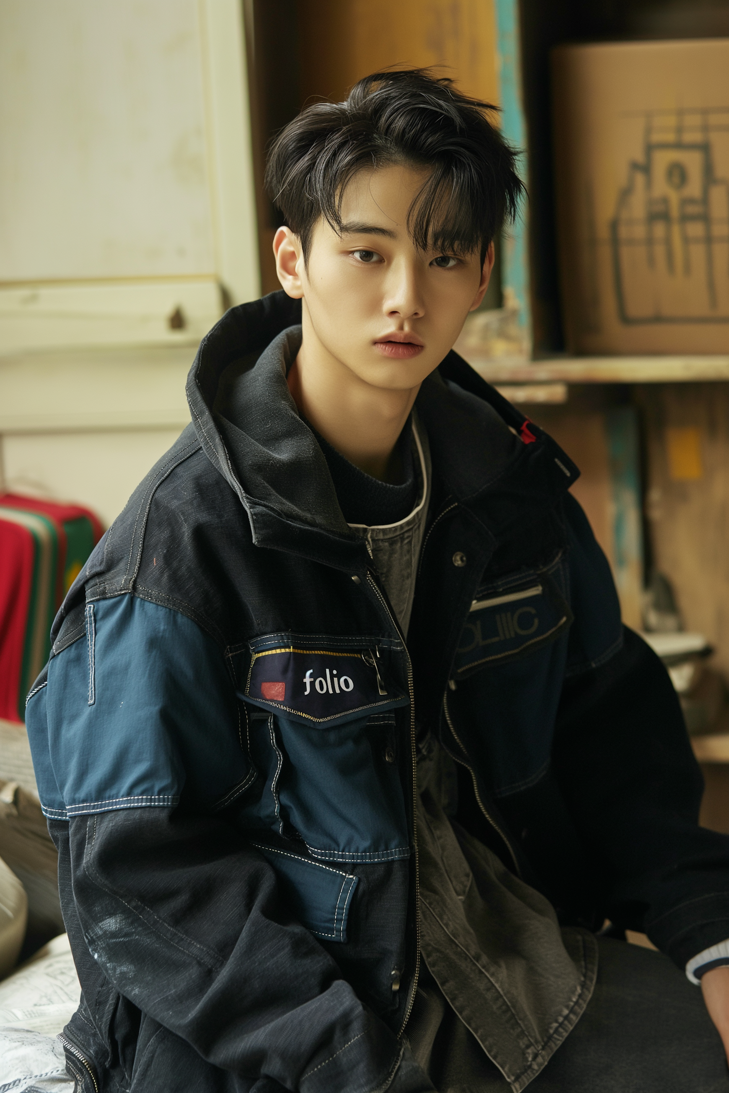 Asian male in a dark jacket with 'folio' patch, sitting in a cozy room with soft lighting and a blurred background.