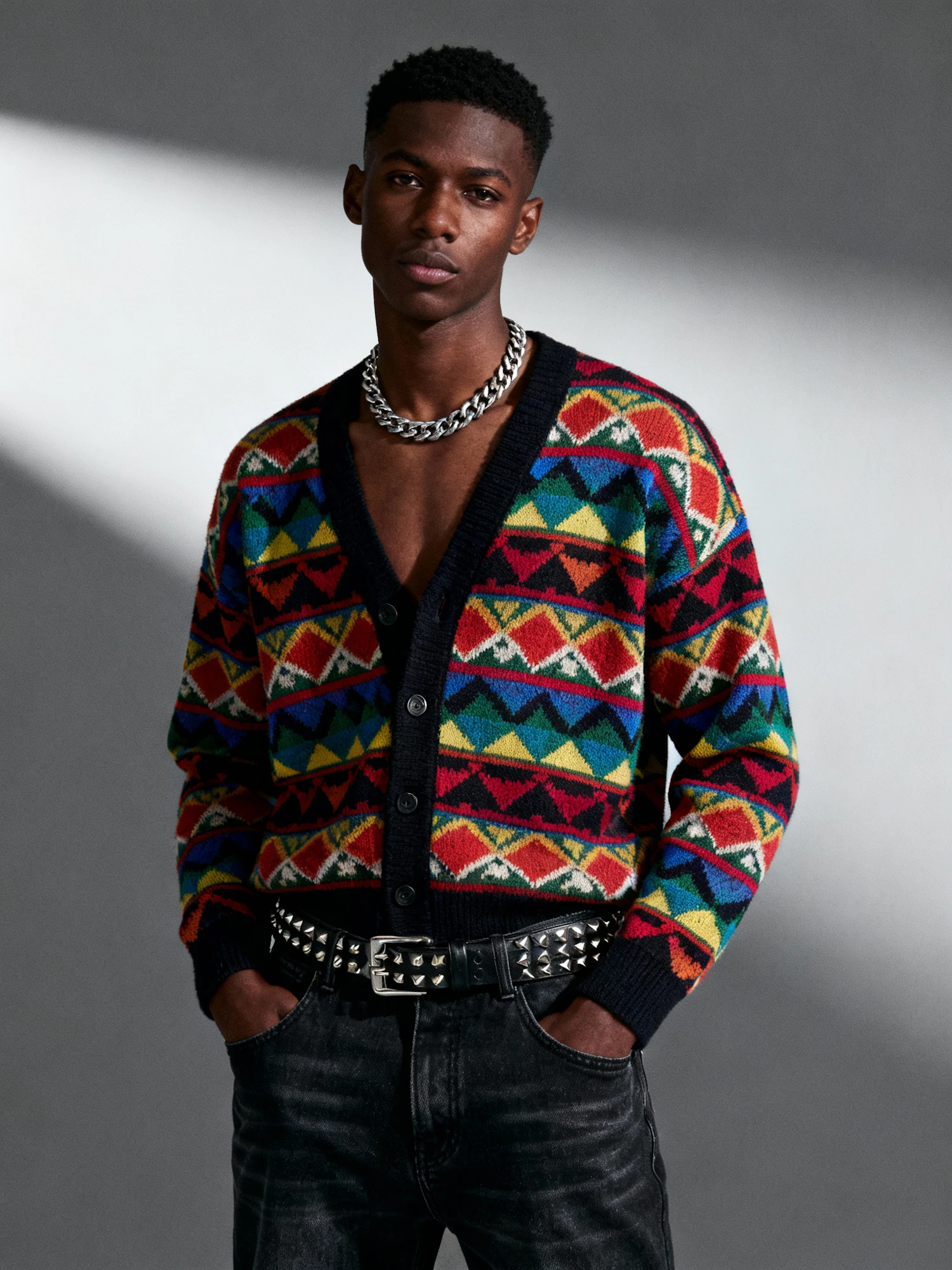 Stylish young man in a colorful geometric cardigan, studded belt, and silver chain, posing confidently against a neutral backdrop.