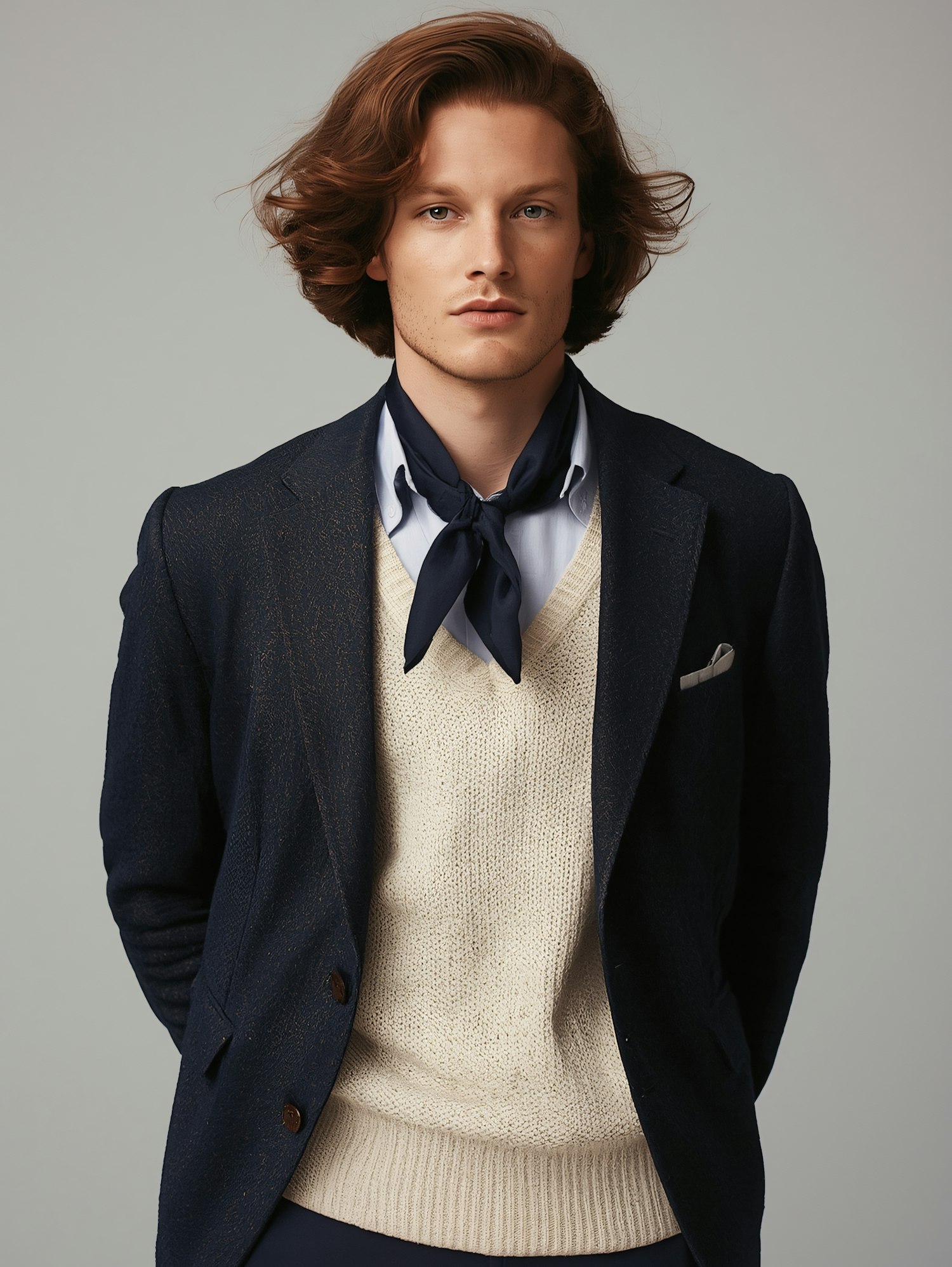 A stylishly dressed man with auburn hair and a navy blazer poses against a light gray background, exuding a modern and refined look.