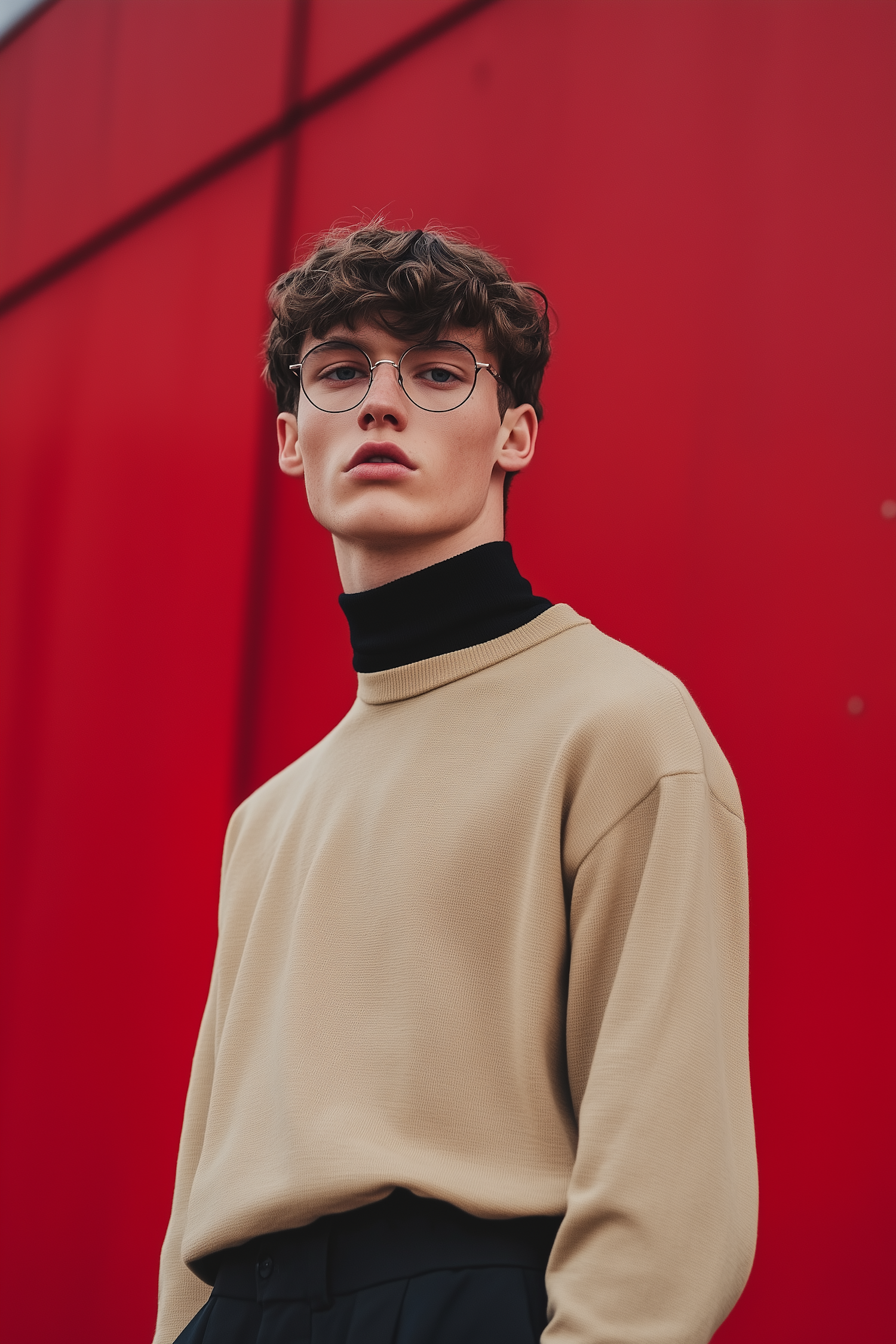 Stylish young man with curly hair and glasses in beige sweater against a bold red background.