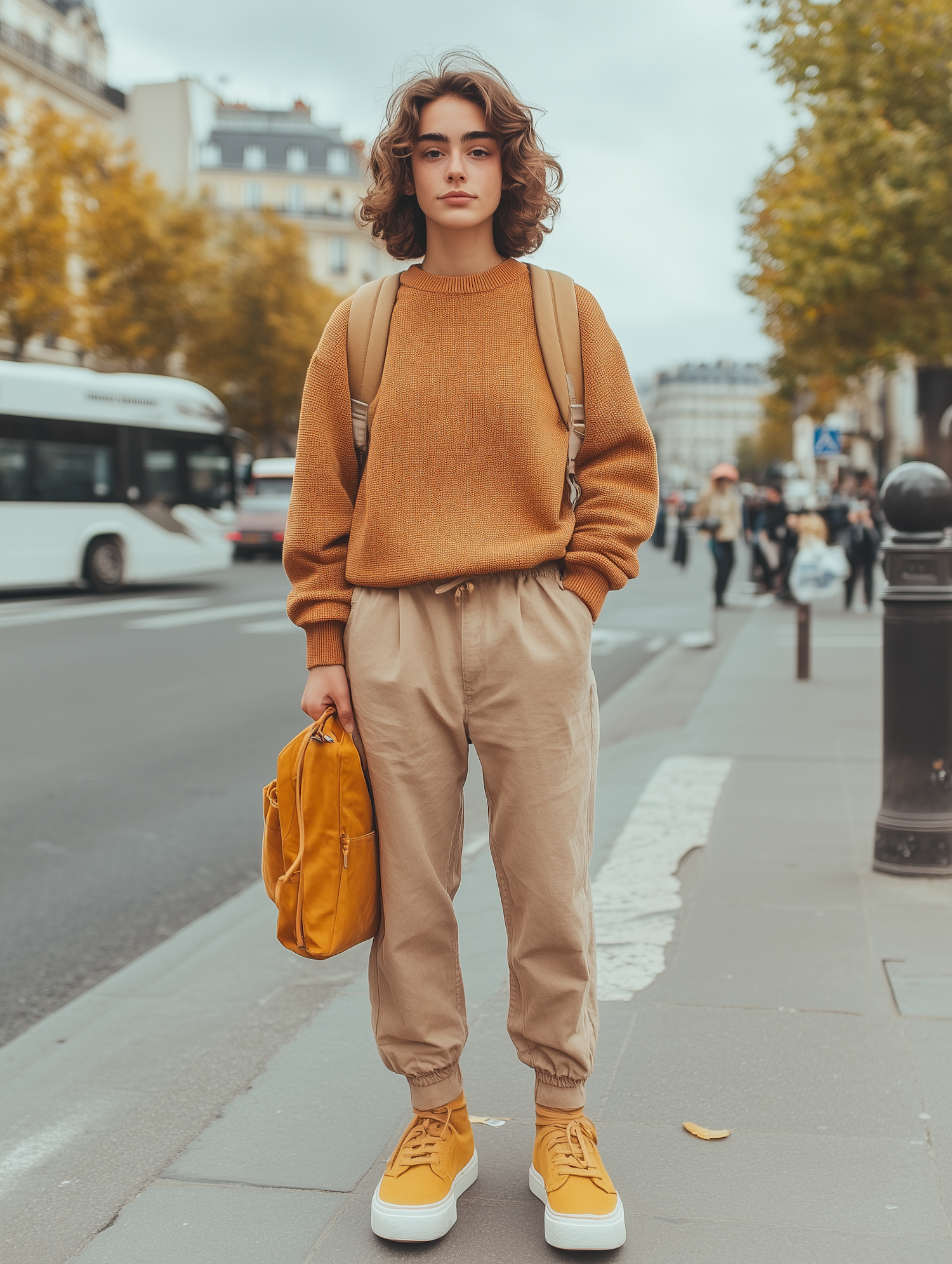 Young woman in orange sweater and beige pants stands on city street with yellow sneakers and backpack, autumn trees in background.