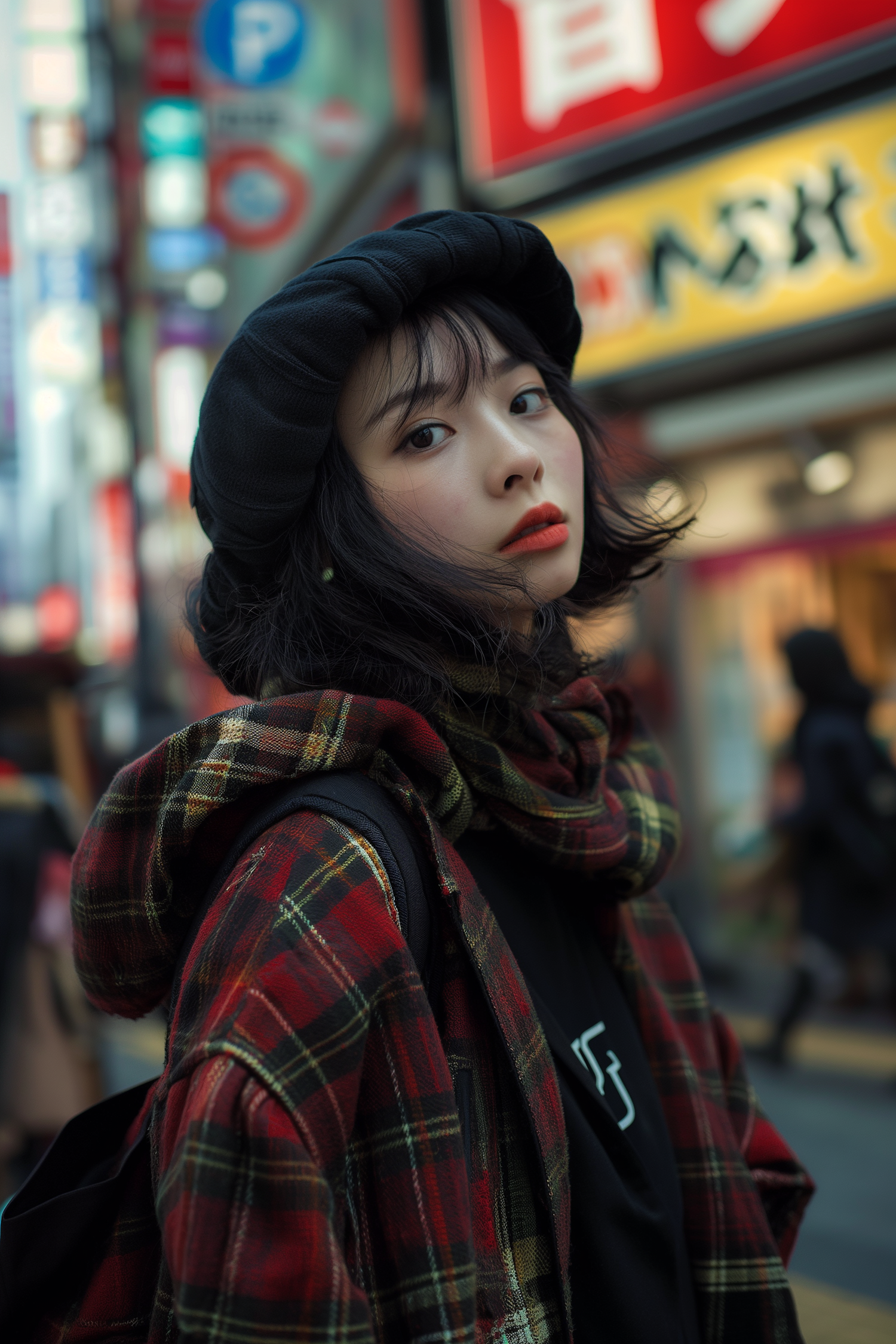 Stylish woman in plaid jacket and beret on a bustling city street with colorful signs.