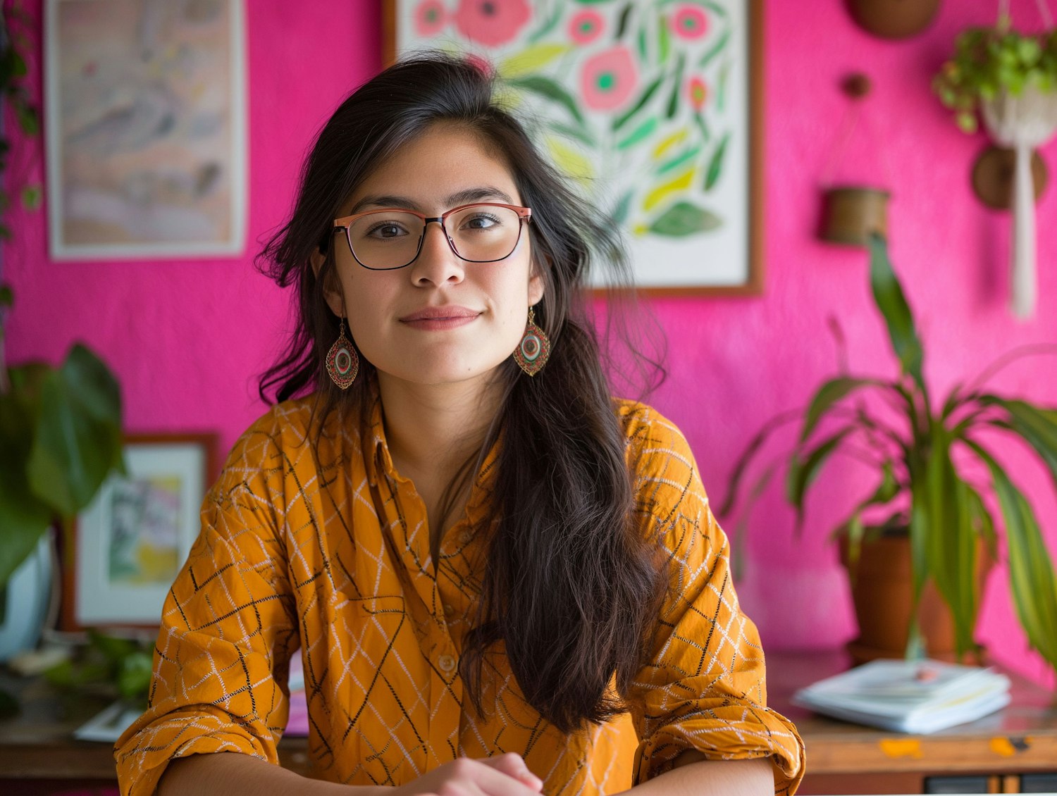 Asian woman in a vibrant room with pink walls, wearing glasses and a yellow shirt, surrounded by plants and floral artwork.