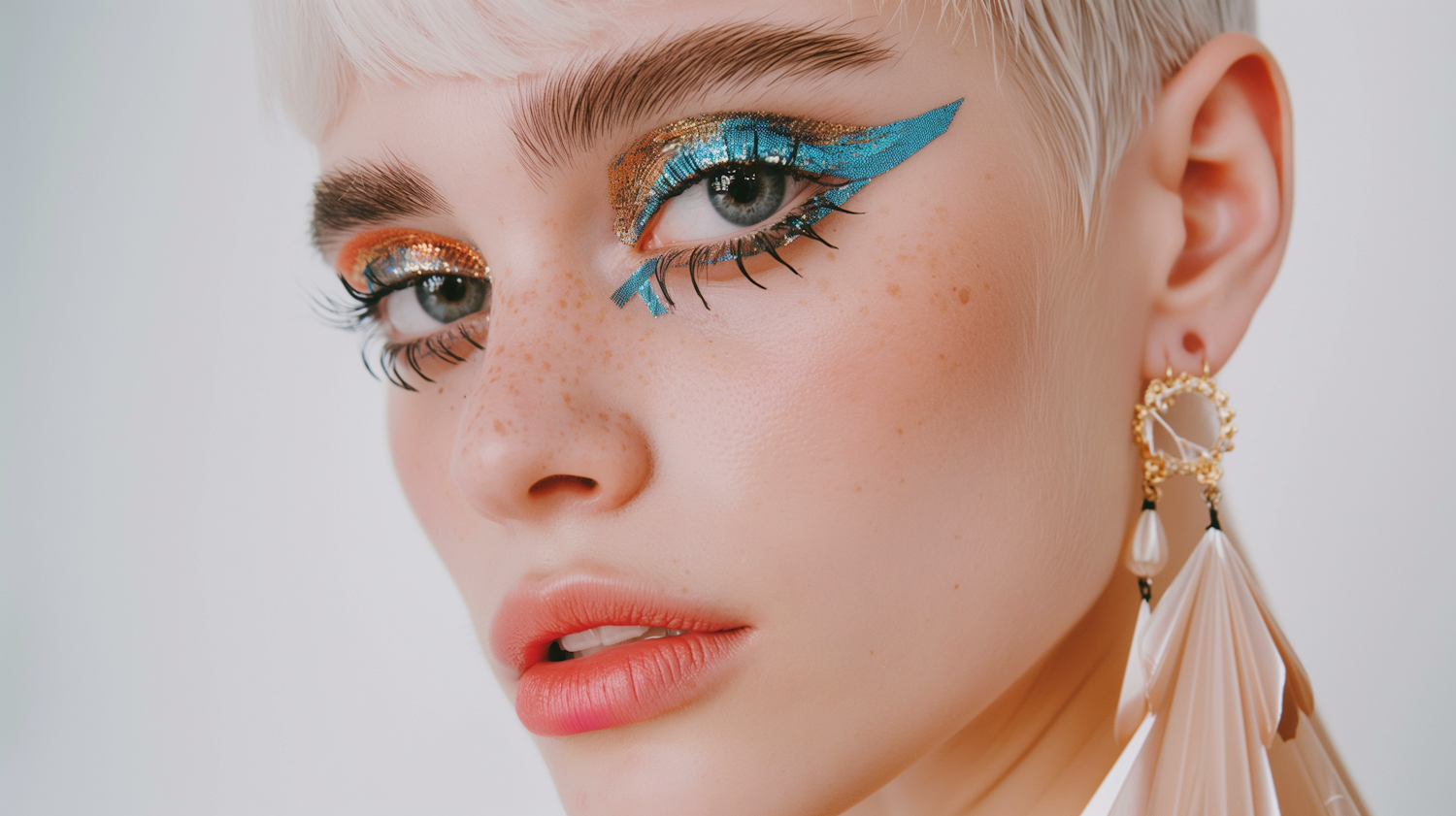 Close-up of a woman with bold blue and gold eye makeup, coral lips, and ornate earrings. Striking artistic look with platinum blonde hair.
