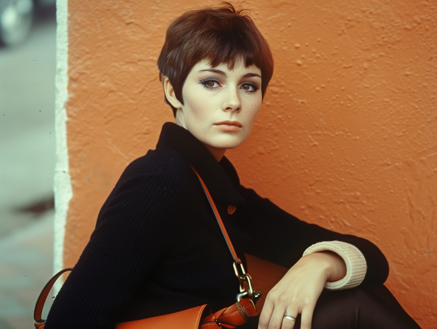 Stylish woman with short brown hair and orange handbag against a textured orange wall, exuding a calm and contemplative vibe.