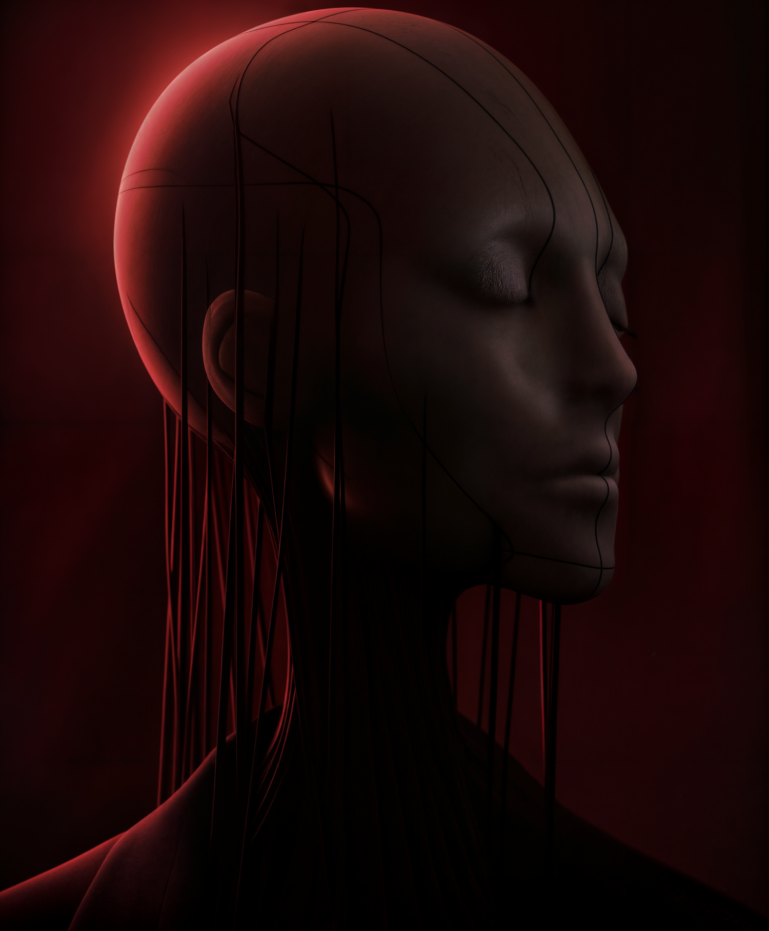Surreal humanoid figure with a smooth face, closed eyes, and black tendrils, set against a deep red background.