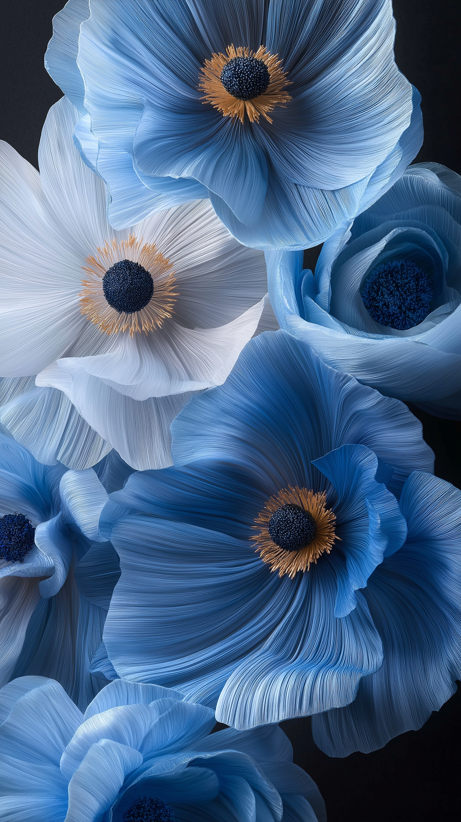 Elegant blue and white flowers with intricate textures and golden stamens, set against a dark background for a striking visual effect.