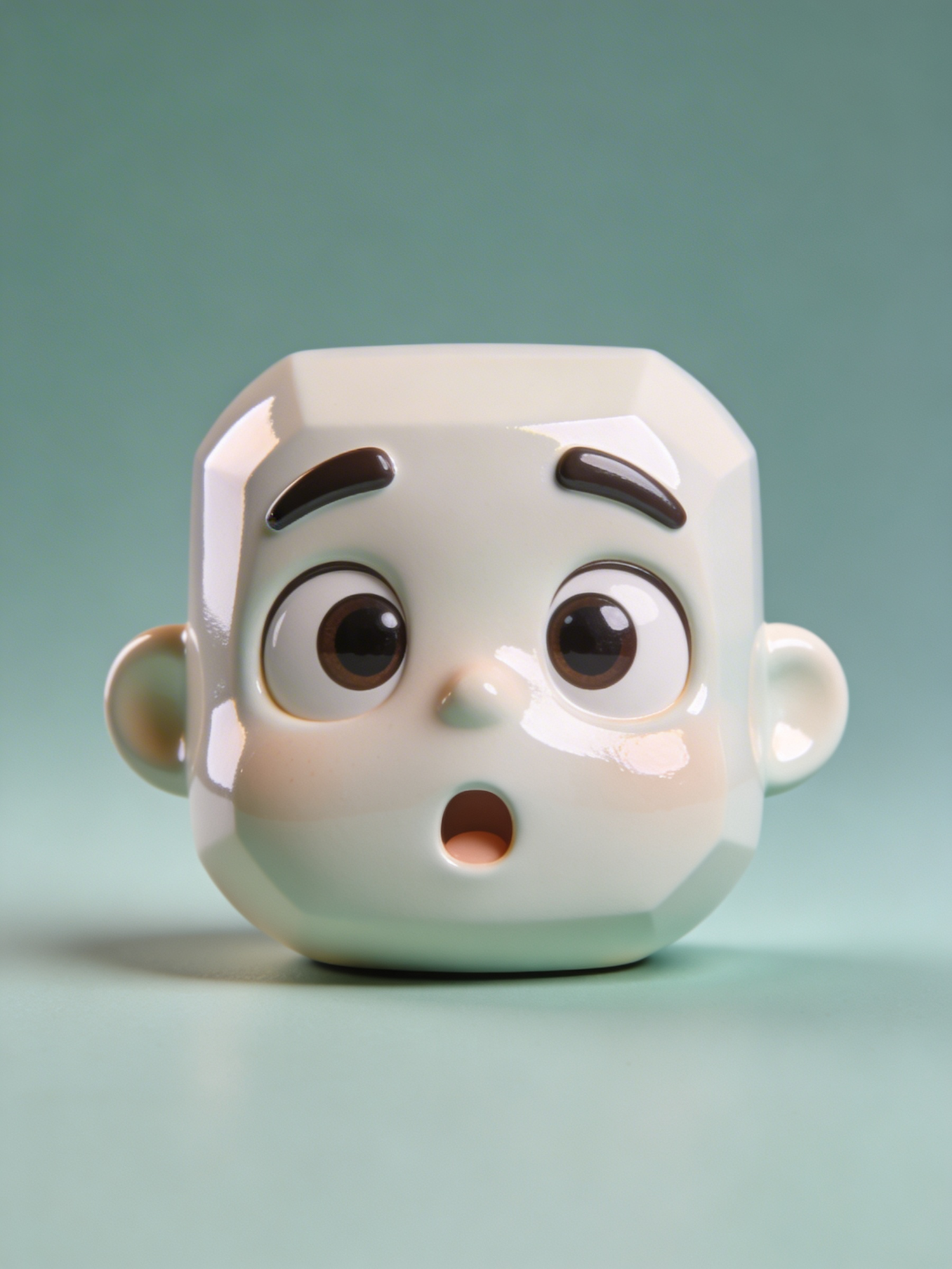 A glossy ceramic figurine with a stylized face and expressive features, set against a soft green background.