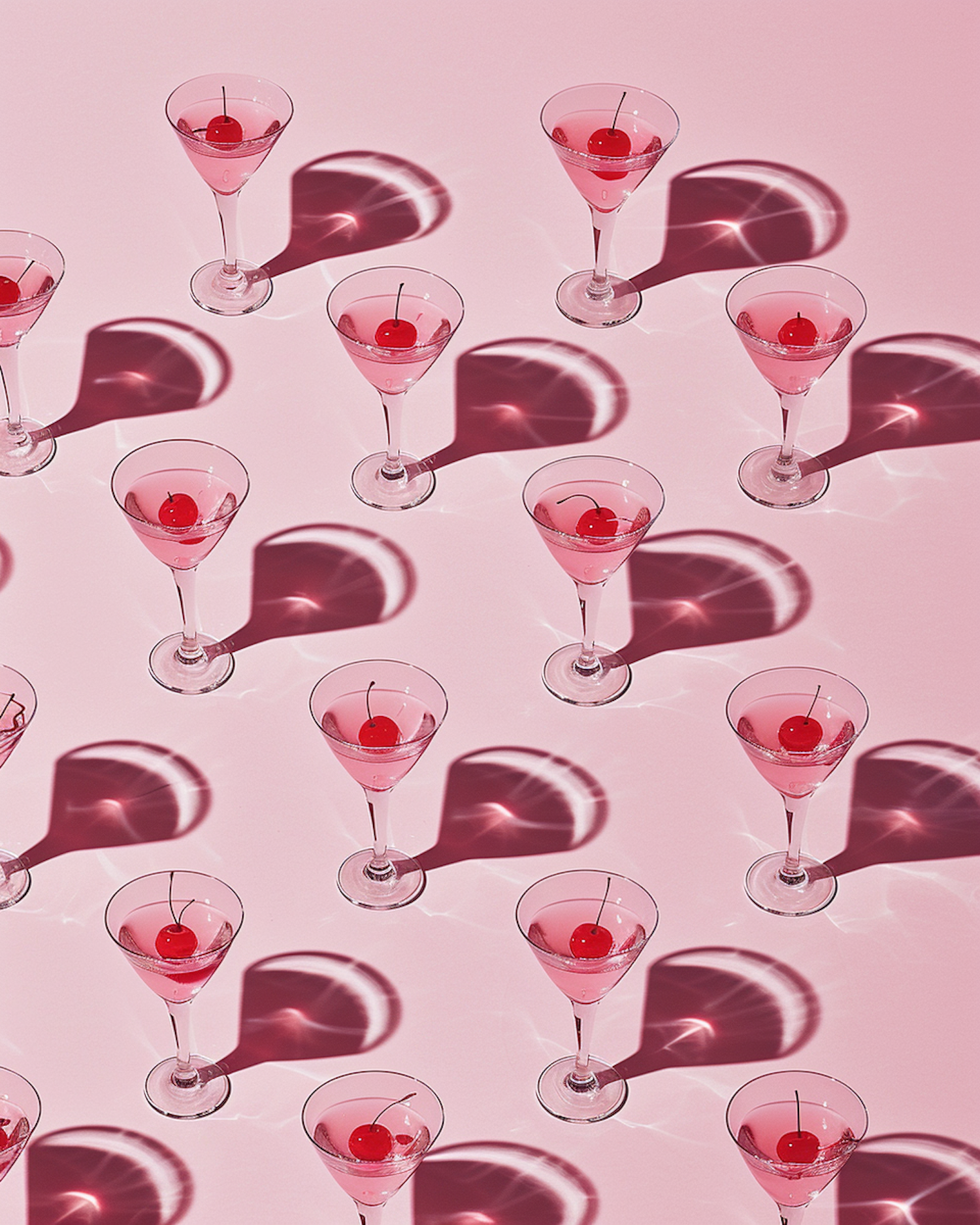 Stylish arrangement of martini glasses with pink drinks and cherries on a pink background, casting artistic shadows.