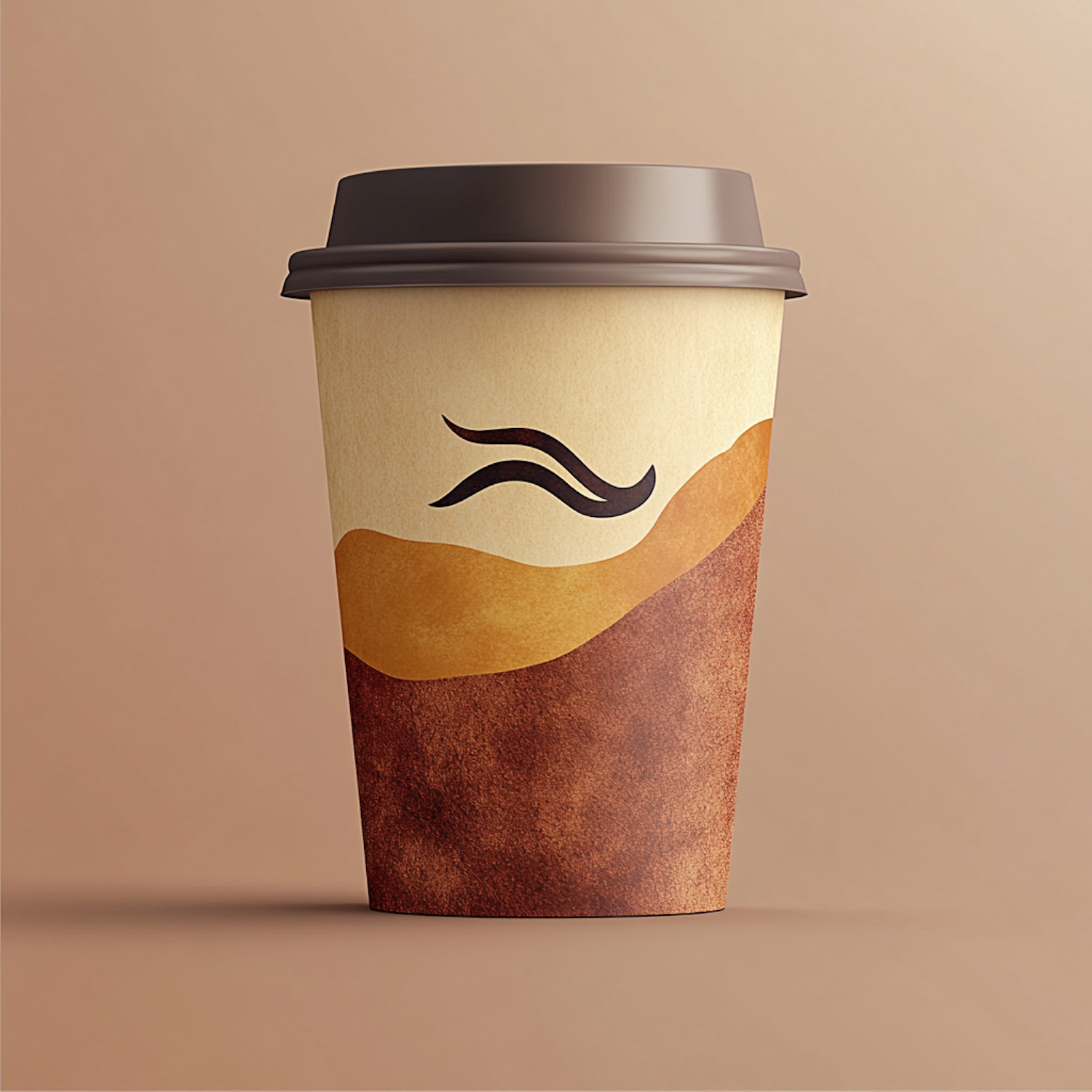 Minimalist coffee cup with earthy tones, desert-inspired design, and a sleek black wave logo. Perfect for modern, eco-friendly branding.