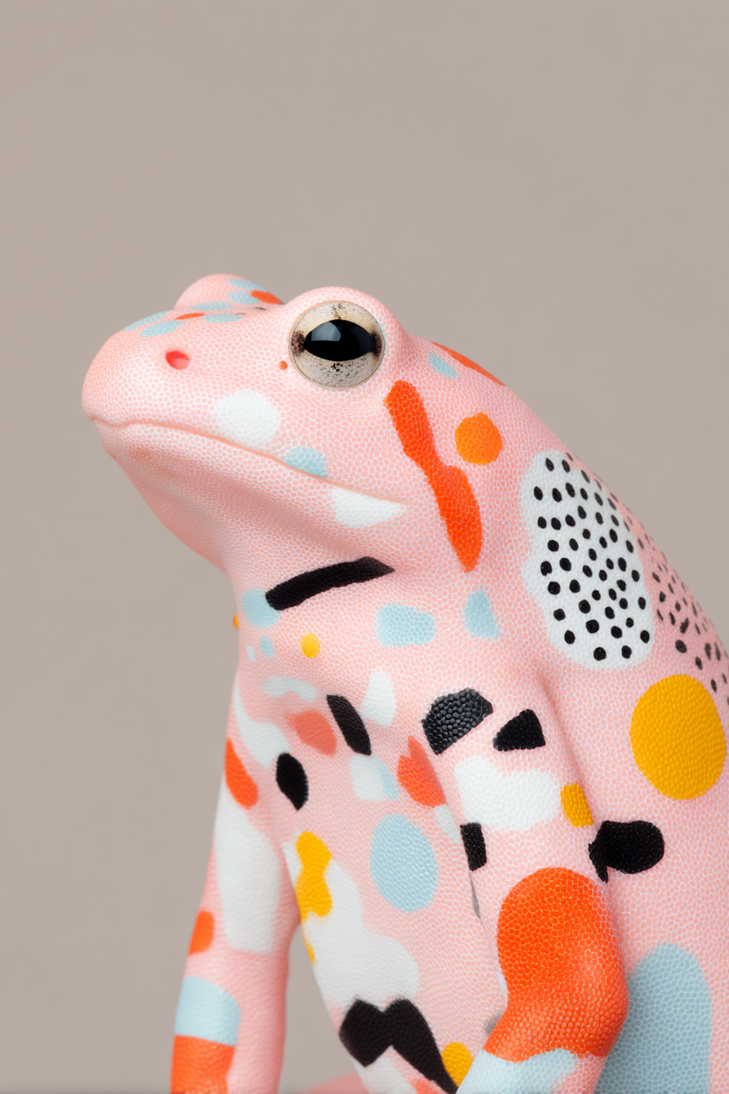 A vibrant, artistic frog with colorful abstract patterns on a pink textured body, set against a neutral beige background.