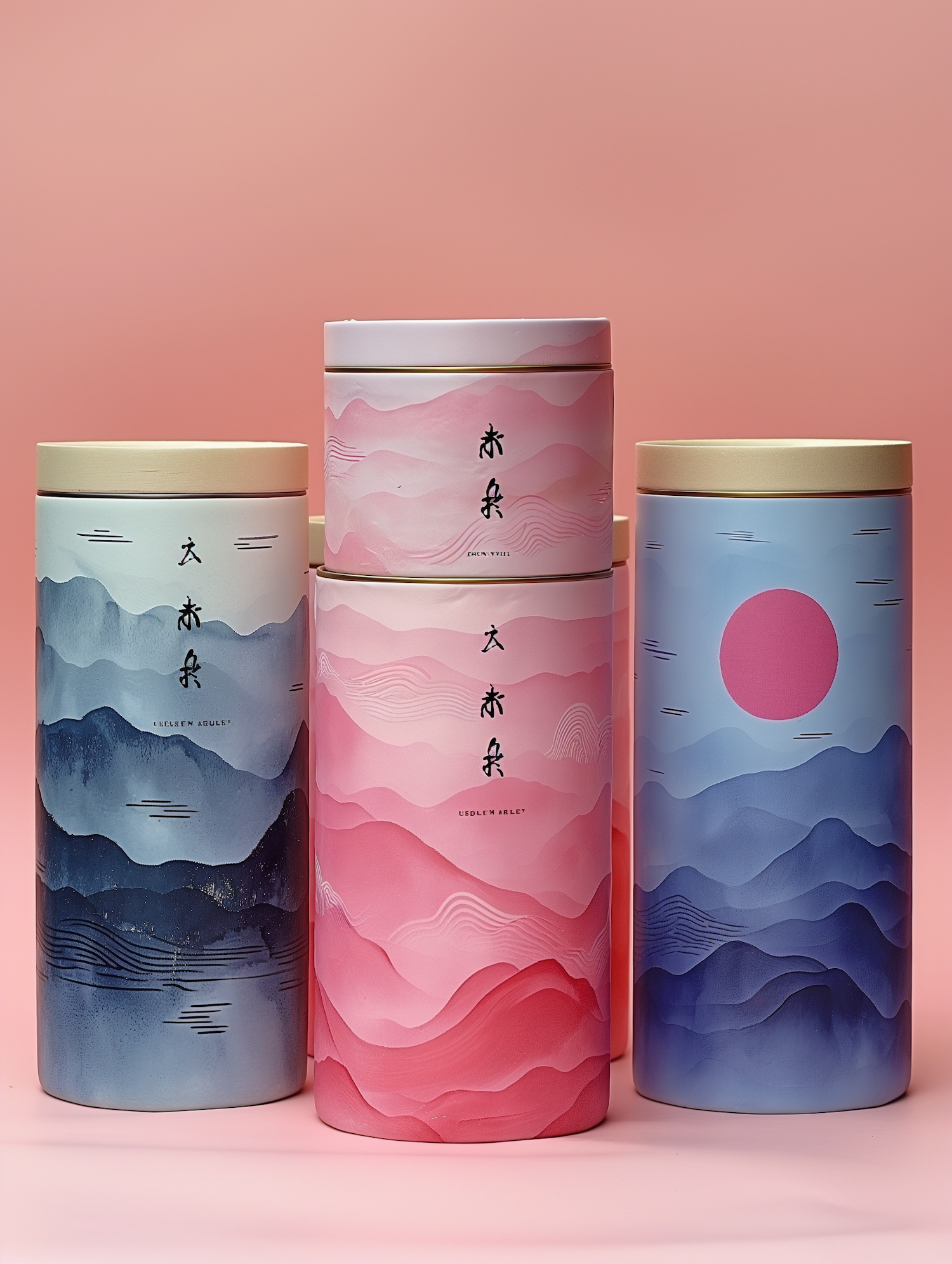 Elegant cylindrical containers with pastel mountain designs and Asian characters, set against a soft pink background.
