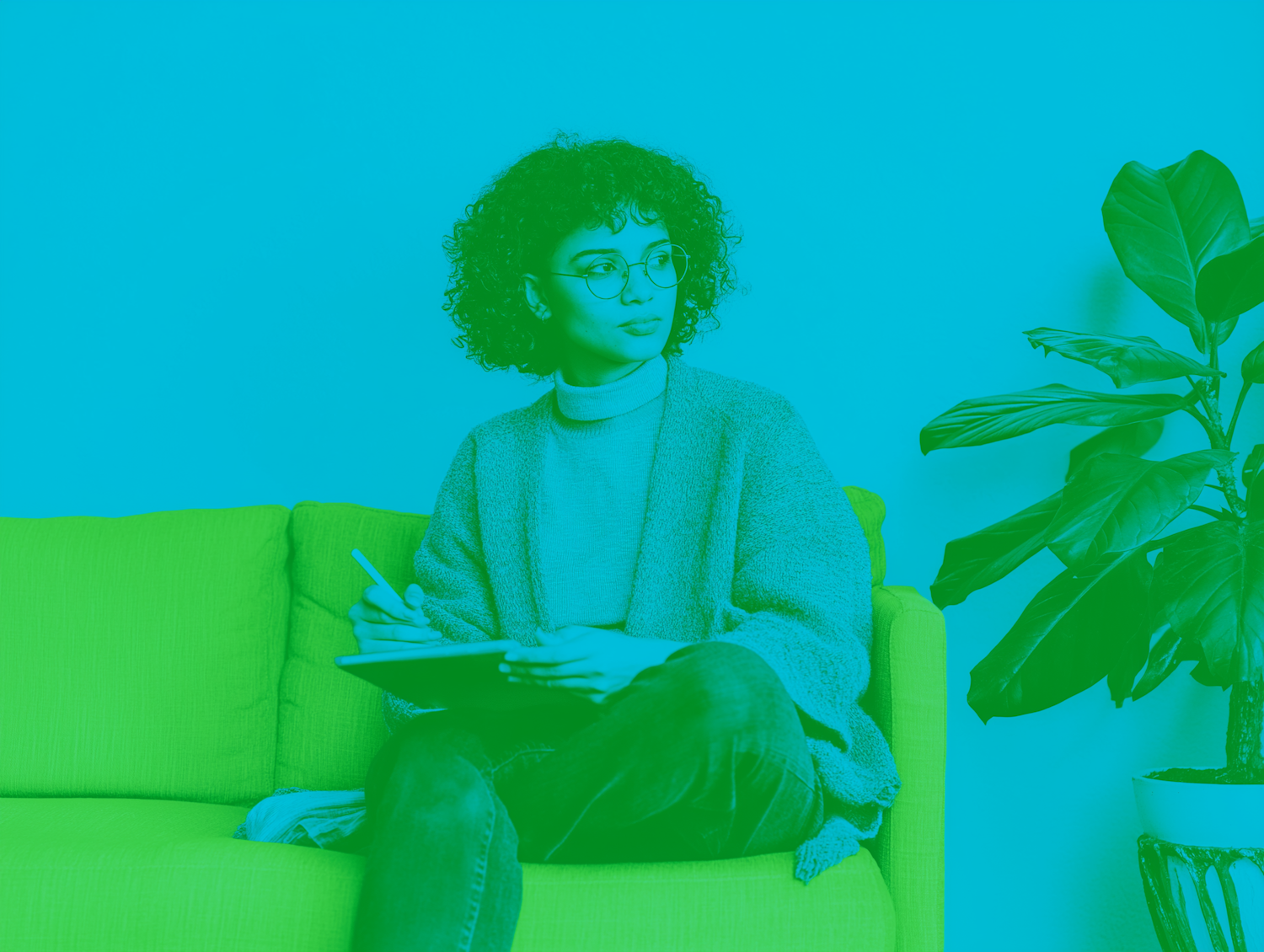 Stylized image of a person with glasses and curly hair sitting on a couch, holding a tablet and stylus, with a plant in the background.