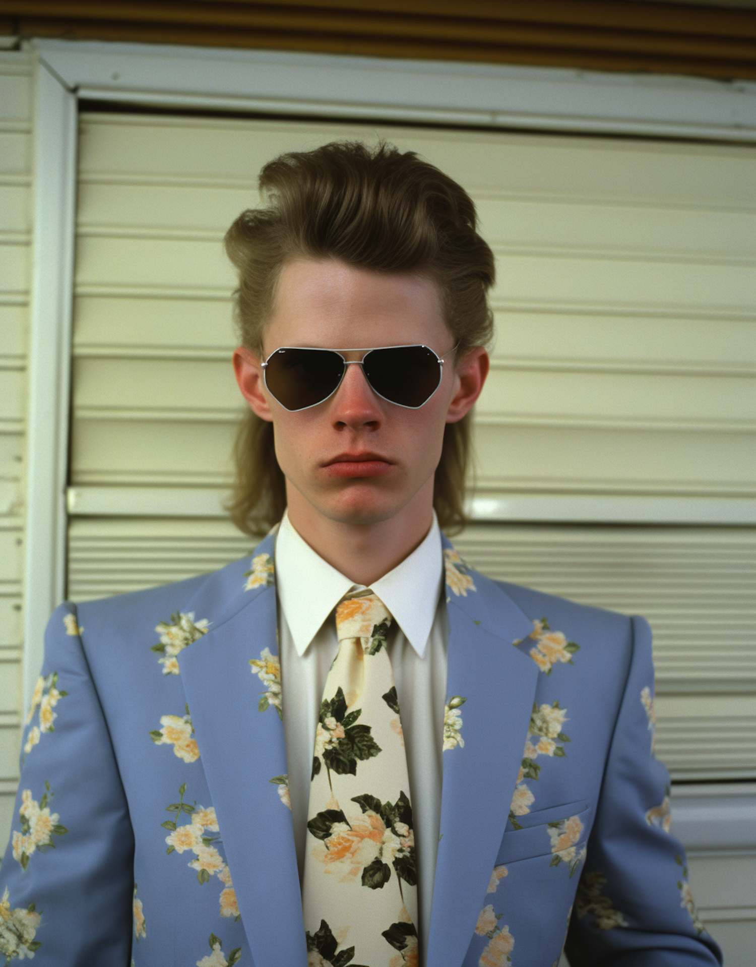 Young man in floral suit and aviator sunglasses with a pompadour hairstyle, standing against a neutral background.