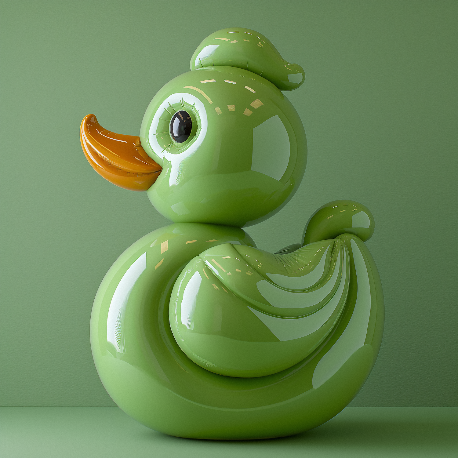 Glossy green rubber duck with an orange beak against a matching background, featuring a playful and modern design.