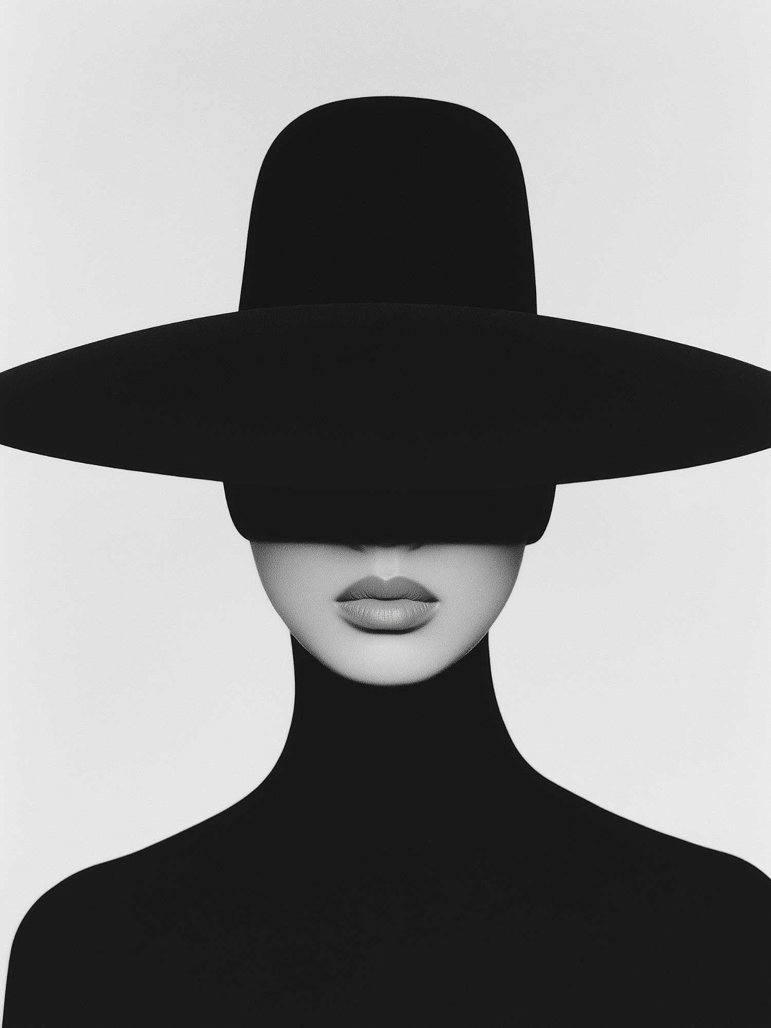 Minimalist black and white portrait with a wide-brimmed hat obscuring the face, creating a mysterious and elegant silhouette.