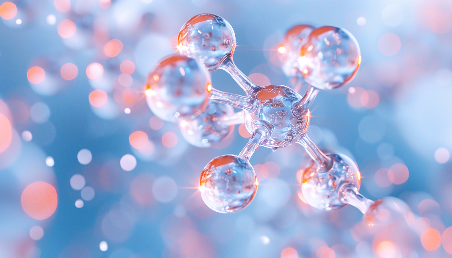 Close-up of a molecular structure with transparent spheres and rods, highlighted in blue and orange hues, against a bokeh background.